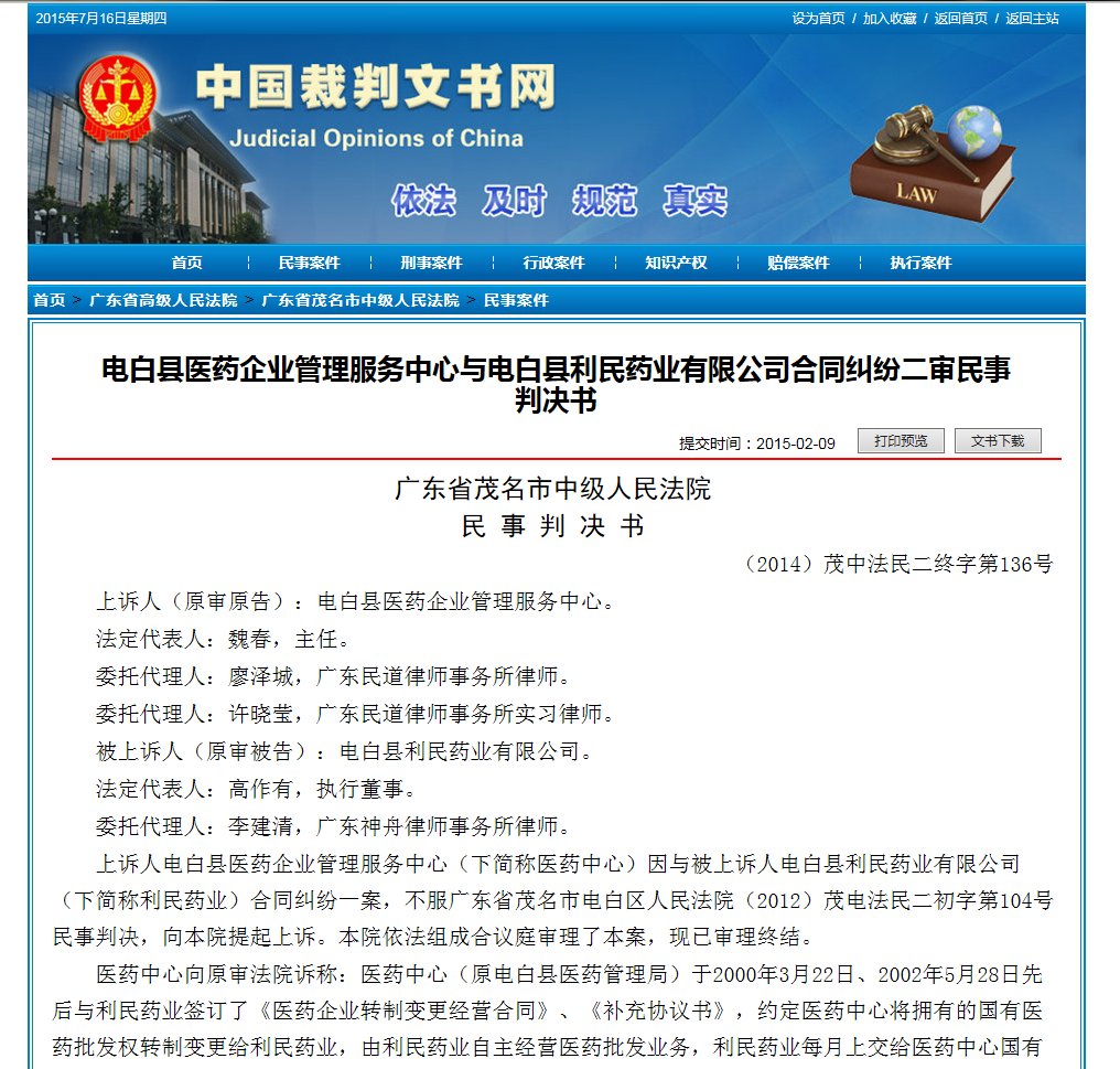 电白县医药企业管理服务中心与电白县利民药业有限合同纠纷判决书 http://www.court.gov.cn/zgcpwsw/gd/gdsmmsz...209_6574445.htm [attachmentid=342161] [attachmentid=342162]