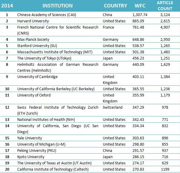 Nature Index 2015 Global:排名前20的机构