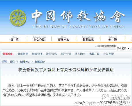 据报道,25日一个《少林寺方丈释永信这只大老虎,谁来监督》的帖子在网络热传。内容直指释永信私生活混乱,侵占少林寺财产和玷污少林寺名誉等,网帖署名“释正义”,还留有电话。26日夜,中国嵩山少林寺官方网站发布报案材料,要求“有关部门尽快对造谣者依法进行查处”。
