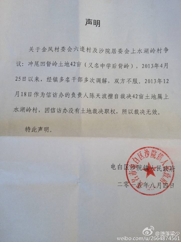 早在2013年12月份,信访办曾调解过碌逢村及水湖岭村的争纷。事隔多年的今年8月,镇政府一纸声明,否定了信访办的调解。镇政府应该为信访办的越权行为负责任并立即更正,多年后多次出现群众事件才终止,有可能导致部分法律观念淡薄的人更会选择火拼解决矛盾,而不相信政府。我们都不想看到的。