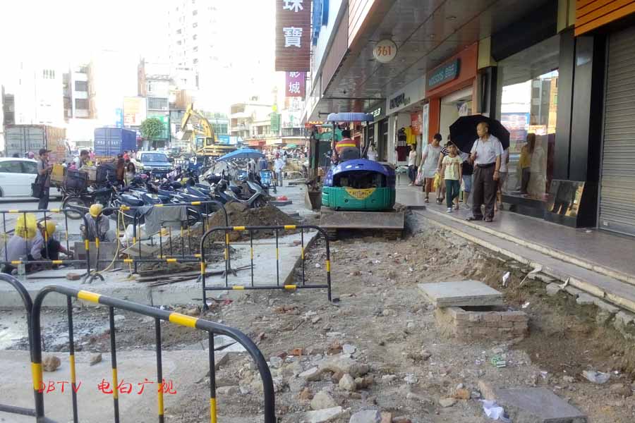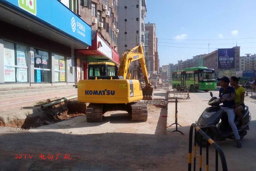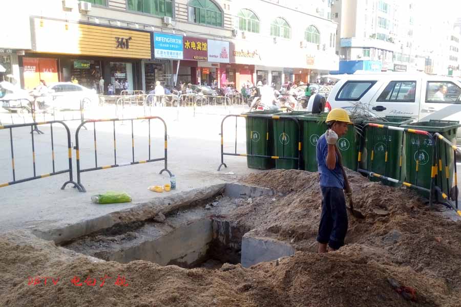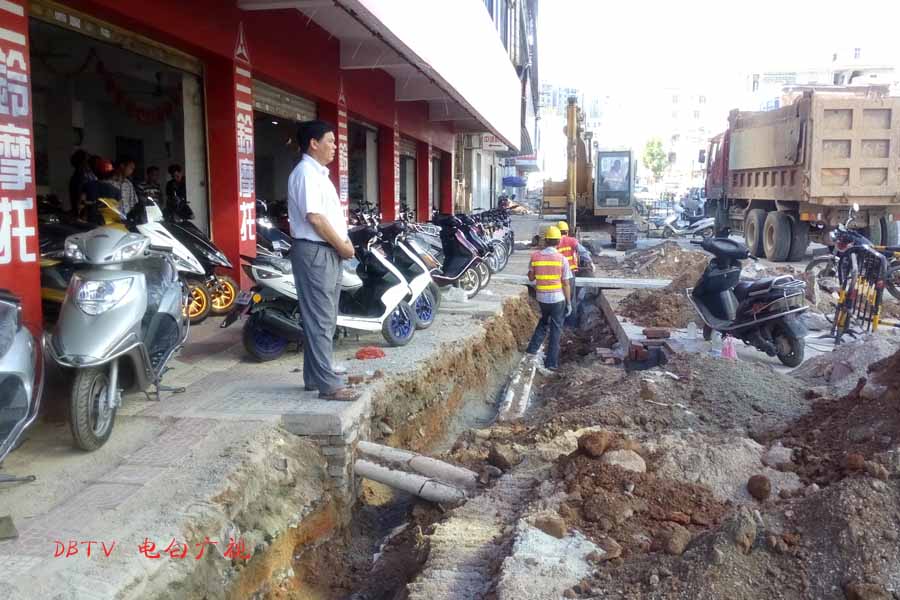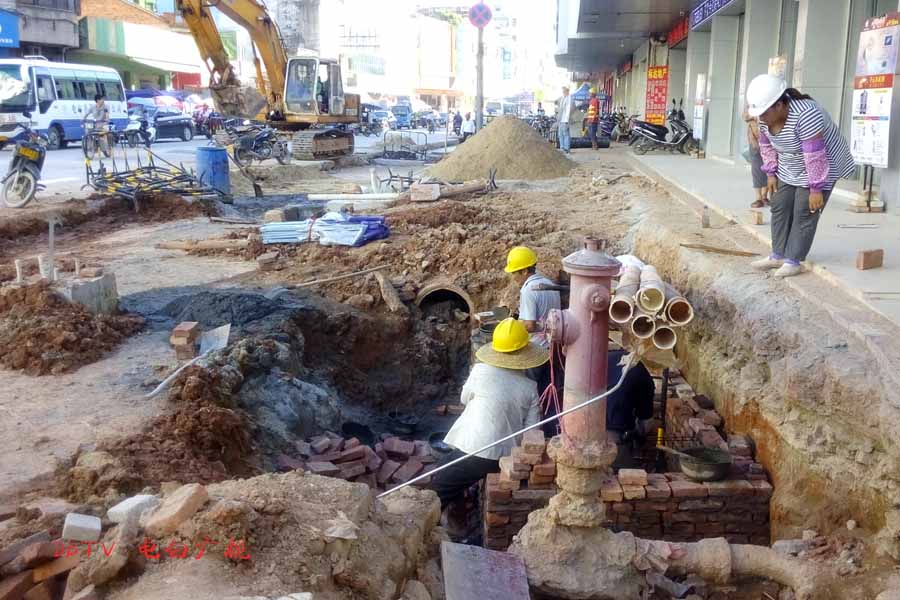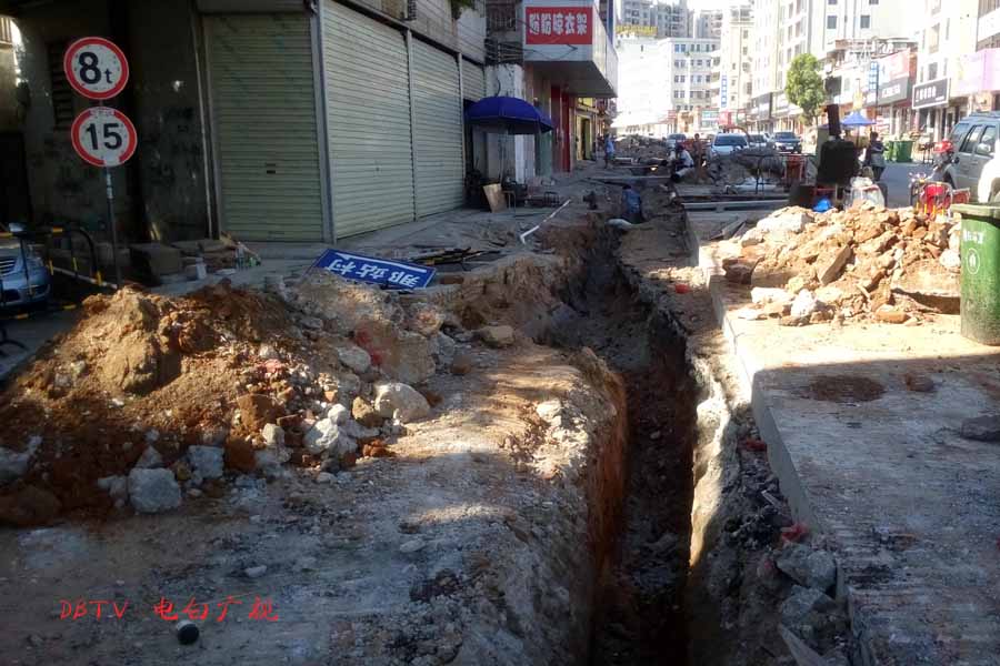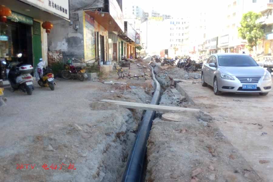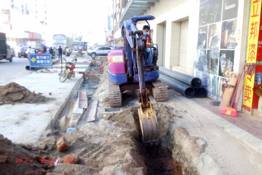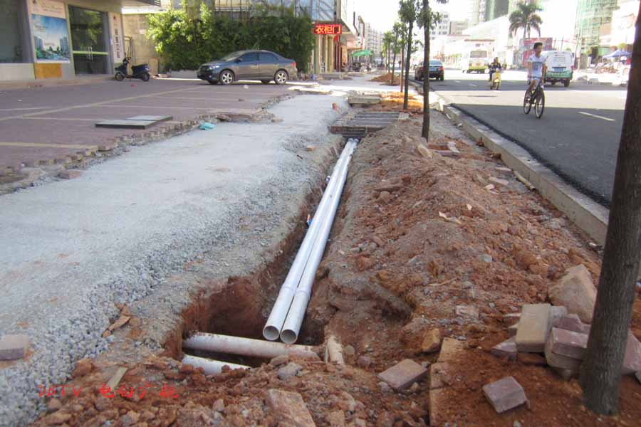 目前的主要施工集中在水东加油站到中心台段,只见人行道被挖开,铺设自来水管道。