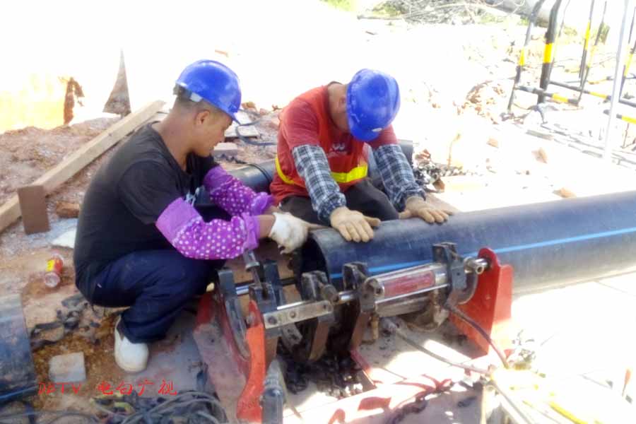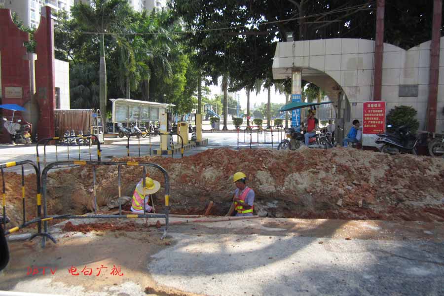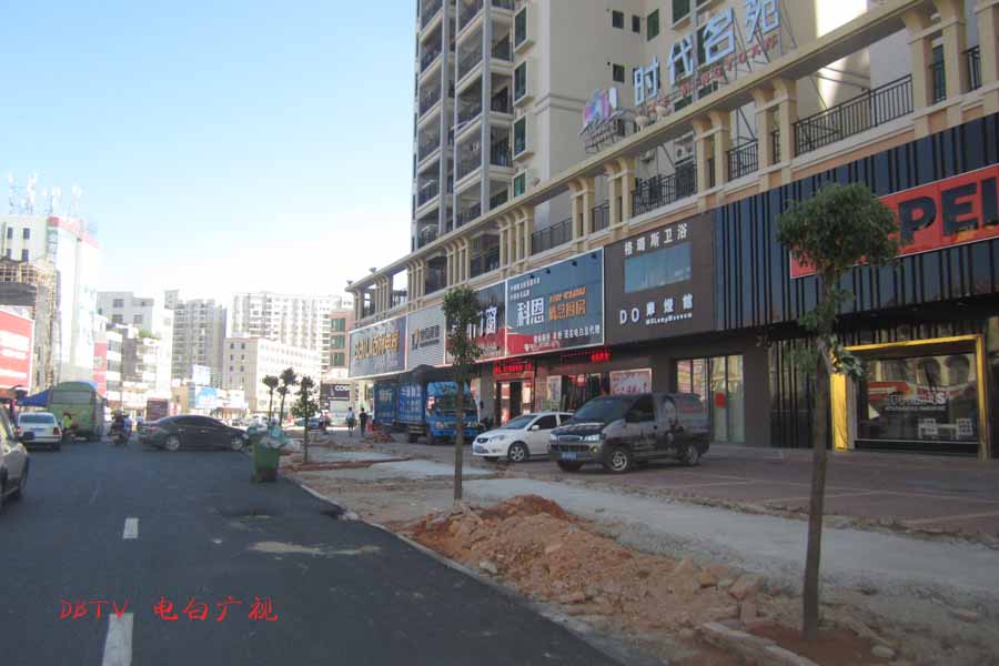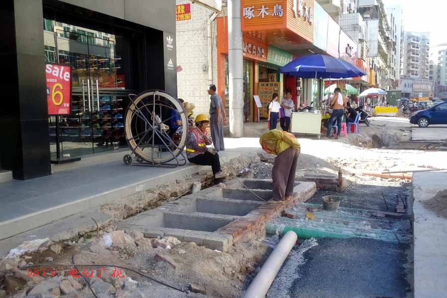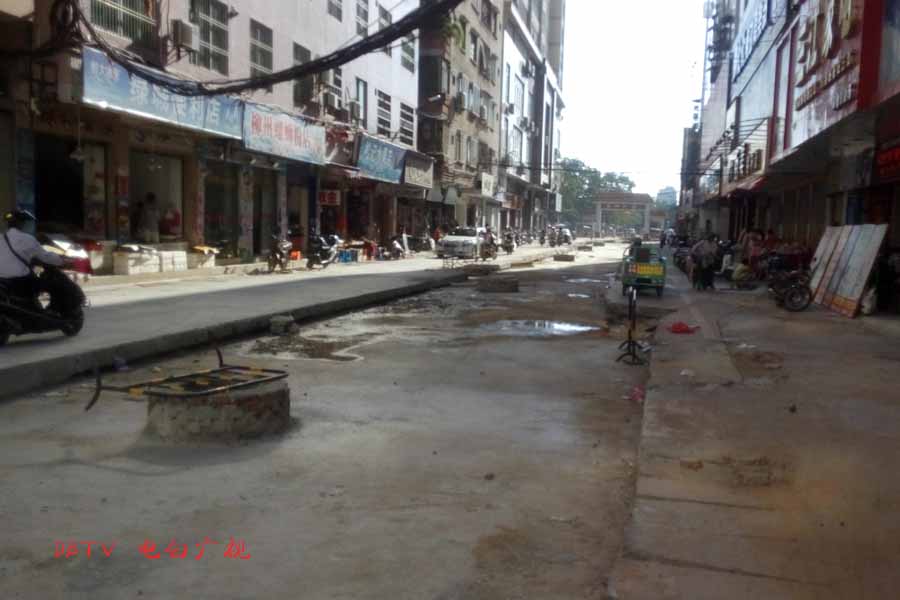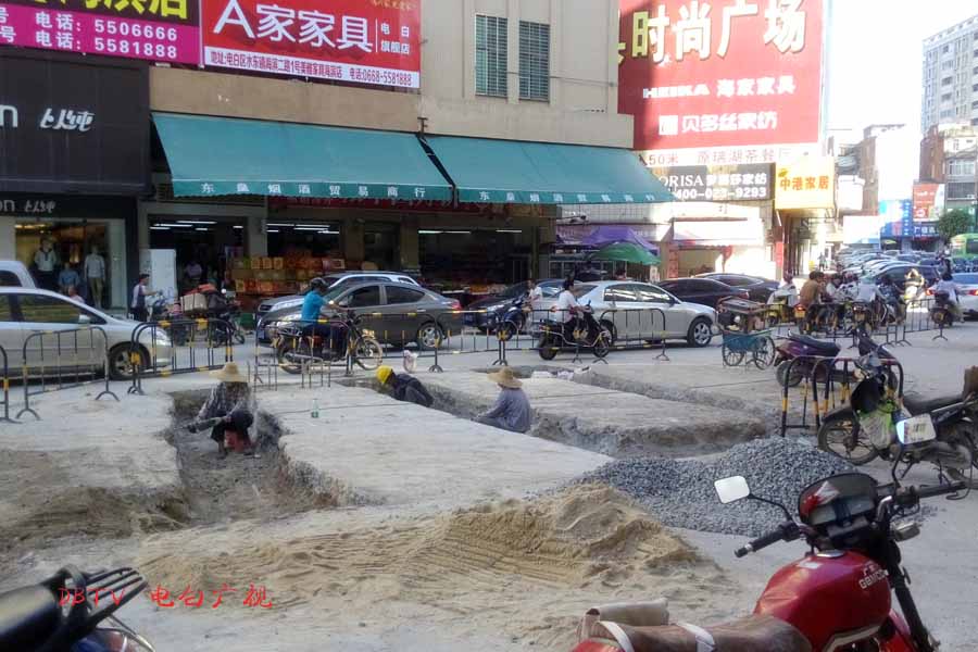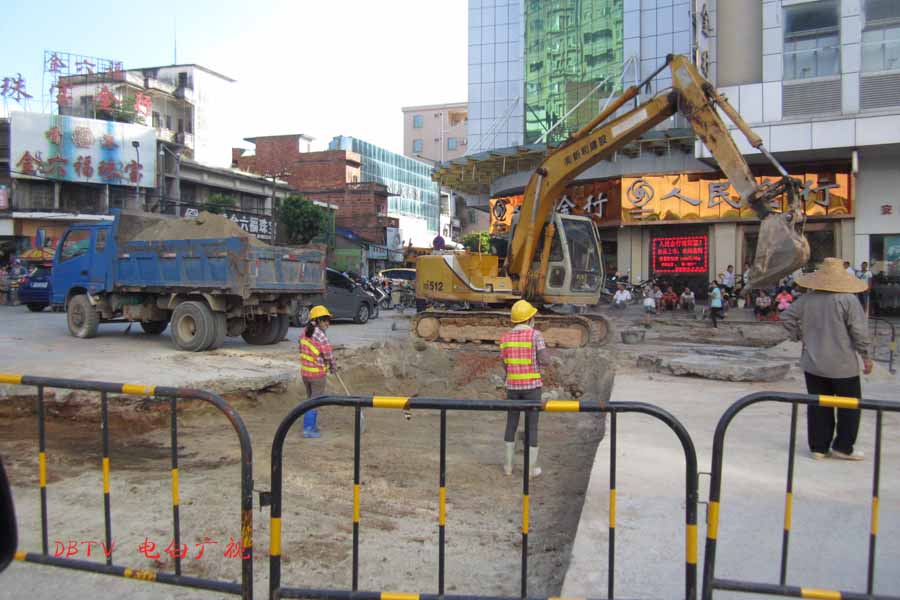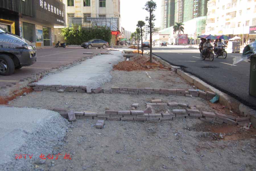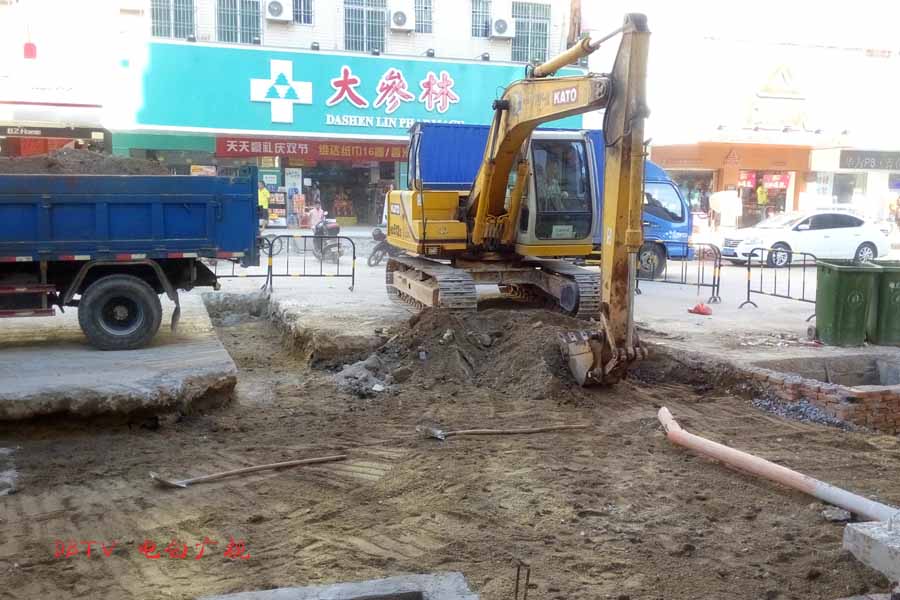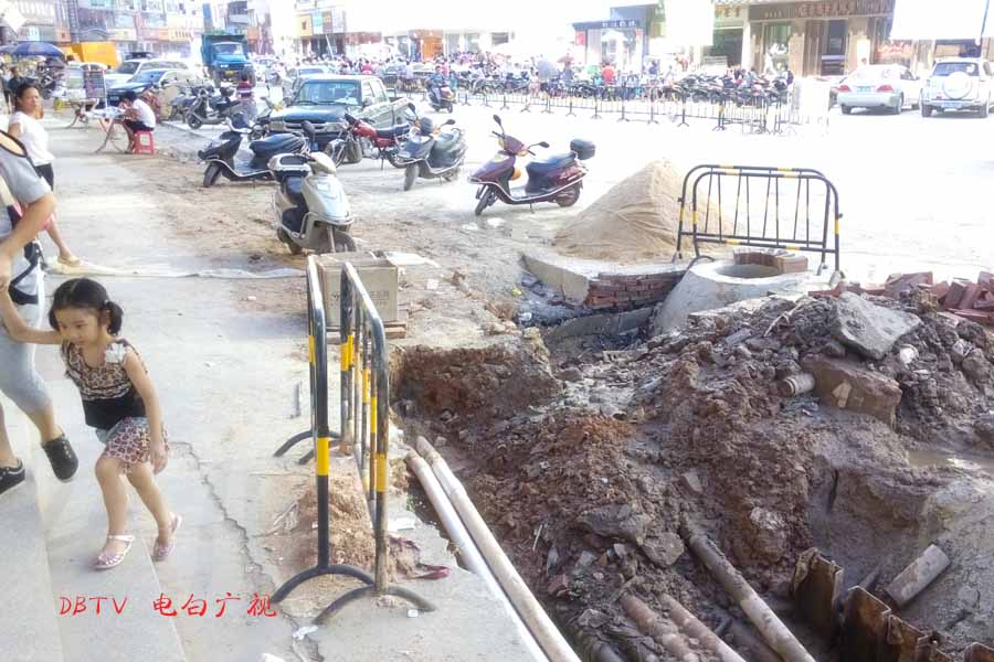 目前的主要施工集中在水东加油站到中心台段,只见人行道被挖开,铺设自来水管道。
