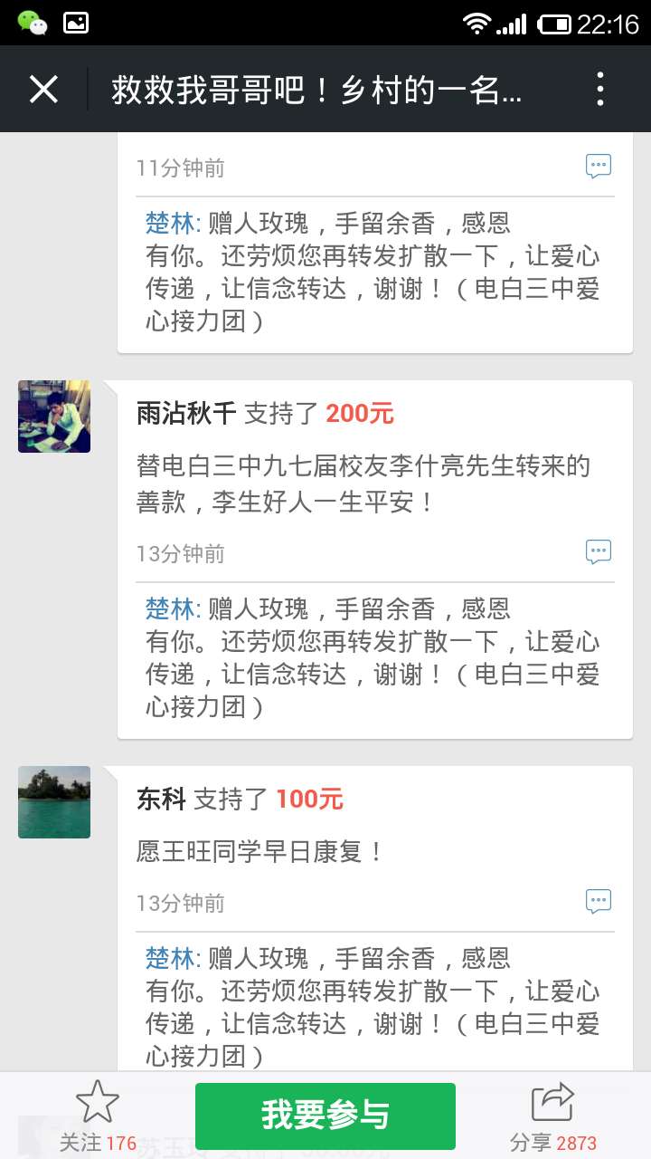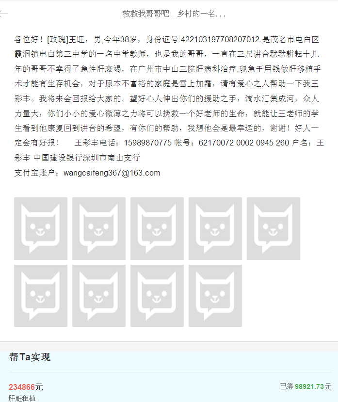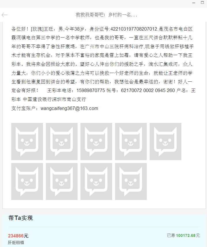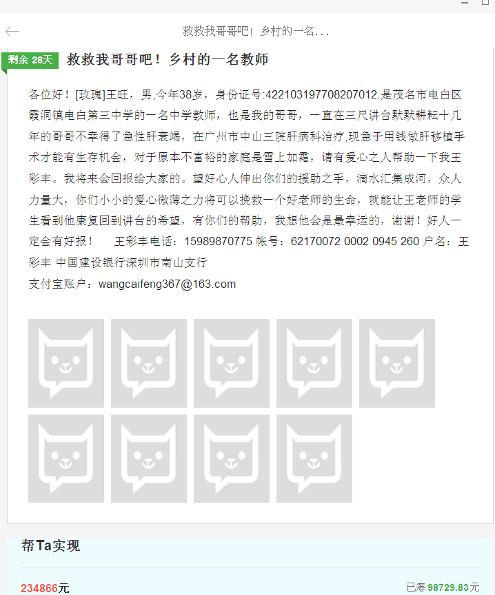 大家提防骗子。捐款帐号和众筹平台的不会变。非常感谢你的支持和帮助!赠人玫瑰,手留余香,感恩有你。(电白三中爱心接力团)