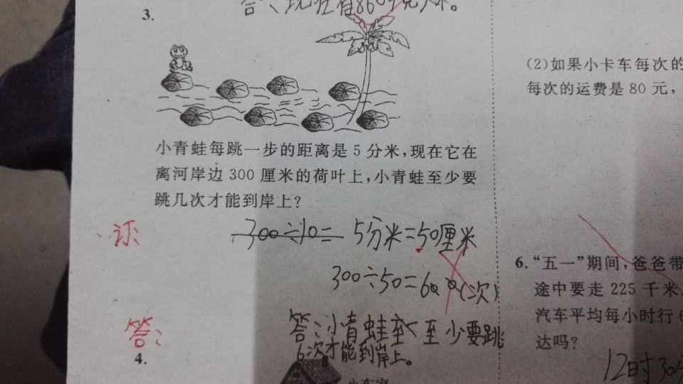 第六下直接就跳到岸上了。在这类小学低年级数学题目中,不特别注明的情况下,就可默认岸边与岸上为同一个点来处理,否则,就应该注明岸的高度。出题者的想法可没有这么复杂,反而批改老师去想复杂了。这道题所考的知识点无非一个是单位的转换,另一个是对除法的应用。如果非要钻那些牛角尖,大把有得钻,比如青蛙跳进水里游过去也完全可以的,当然前提是河里必须要有水。