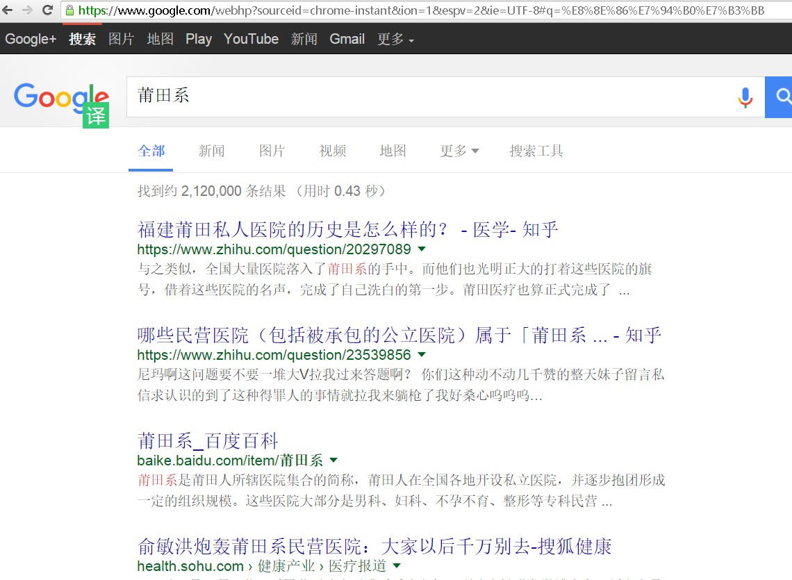 掸子 初中三年级 注册 2006-07-18 消息 518 反馈评分 19 点数 1 2016-01-22 #1 最近写论文找资料,打开百度,一大堆莆田系。谷歌定位一找一个准! 附件 百度.JPG 232.6 KB · 查看: 178 谷歌.JPG 205.1 KB · 查看: 181 百度-莆田系.JPG 179.7 KB · 查看: 182 谷歌-莆田系.JPG 184.1 KB · 查看: 141