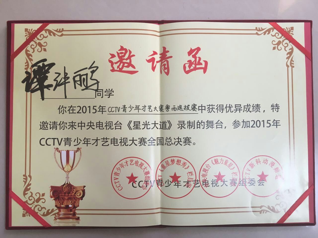 2015年8月,荣获CCTV青少年才艺电视大赛全国总决赛儿童A组声乐金奖;