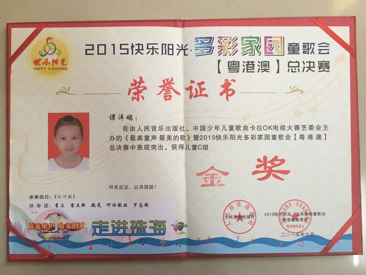 2015年6月,荣获2015快乐阳光多彩家园童歌会(粤港澳)总决赛儿童C组金奖;