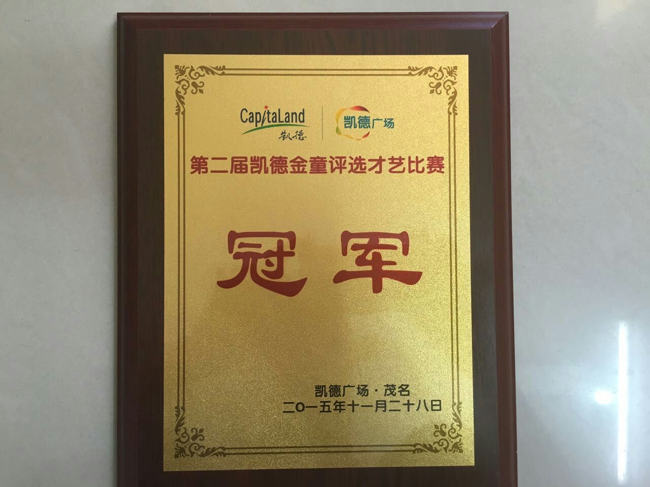 2015年11月,荣获茂名市第二届凯德“金童评选才艺”总决赛冠军;