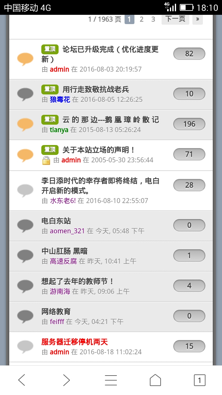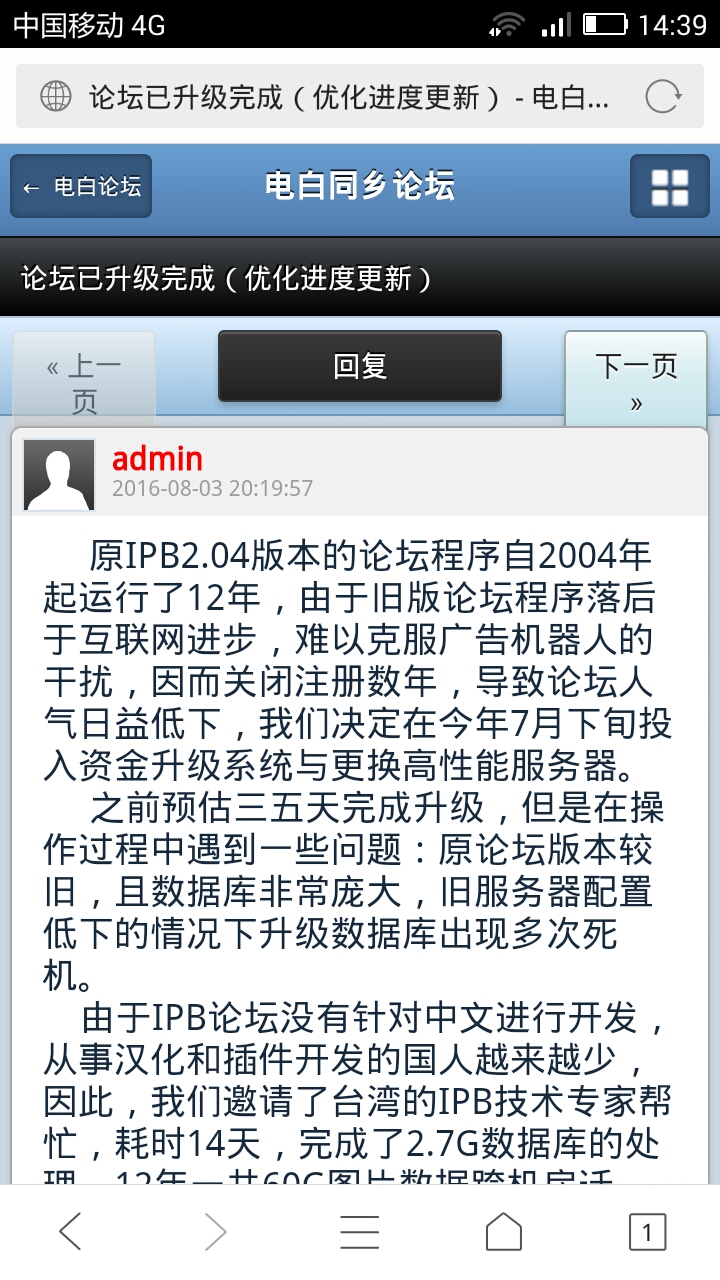 MingNi 管理员 管理员 注册 2005-04-12 消息 130 反馈评分 25 点数 11 性别 男 2016-08-22 #82 清心 说: Screenshot_2016-08-22-14-39-02.jpeg 在手机上看时只能选择下一页或上一页,能任意选择进入的页面吗?或者直接进入是最后一页。 点击展开... 这个手机版为了适应手指头点击,只能是这样,你可以切换到手机版V2,V2可以点击页码,切换方法:点击下方的电脑版,然后点击左下角的切换电脑/手机版,选择手机版v2。