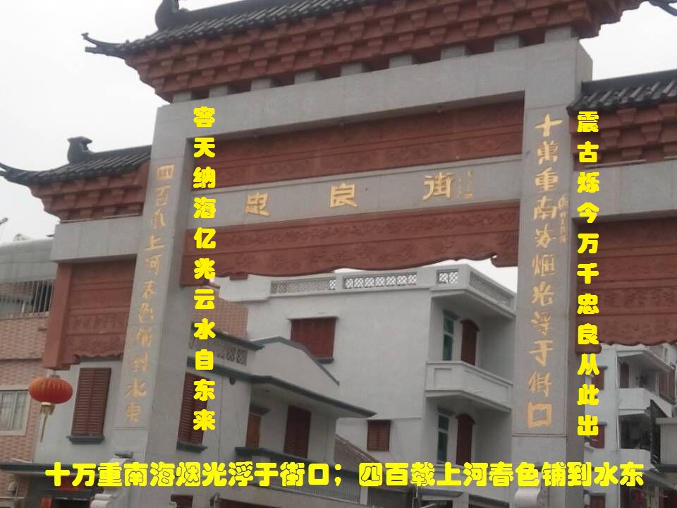 牌坊东面 汉字 :   十万重南海烟光  浮于街口      四百载上河春色  铺到水东