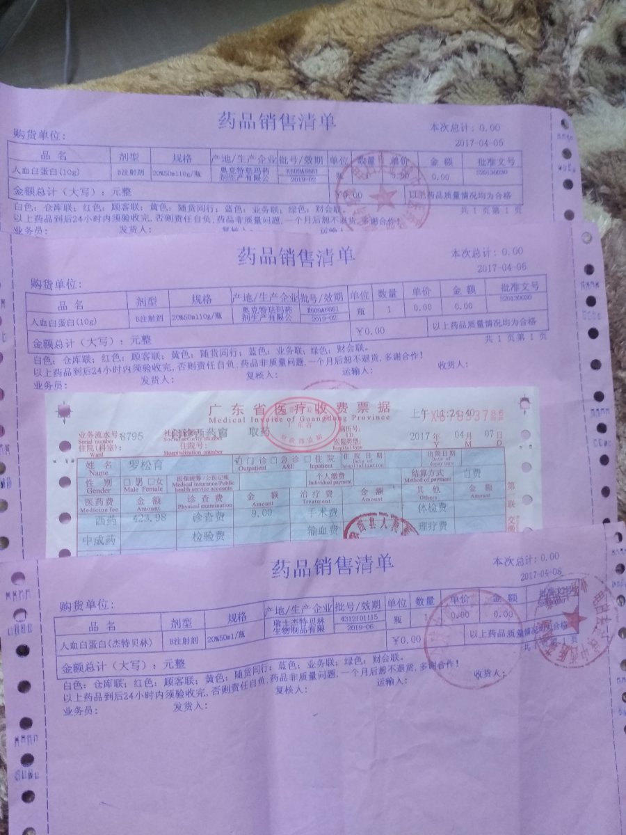 自购四瓶白蛋白、两袋血浆