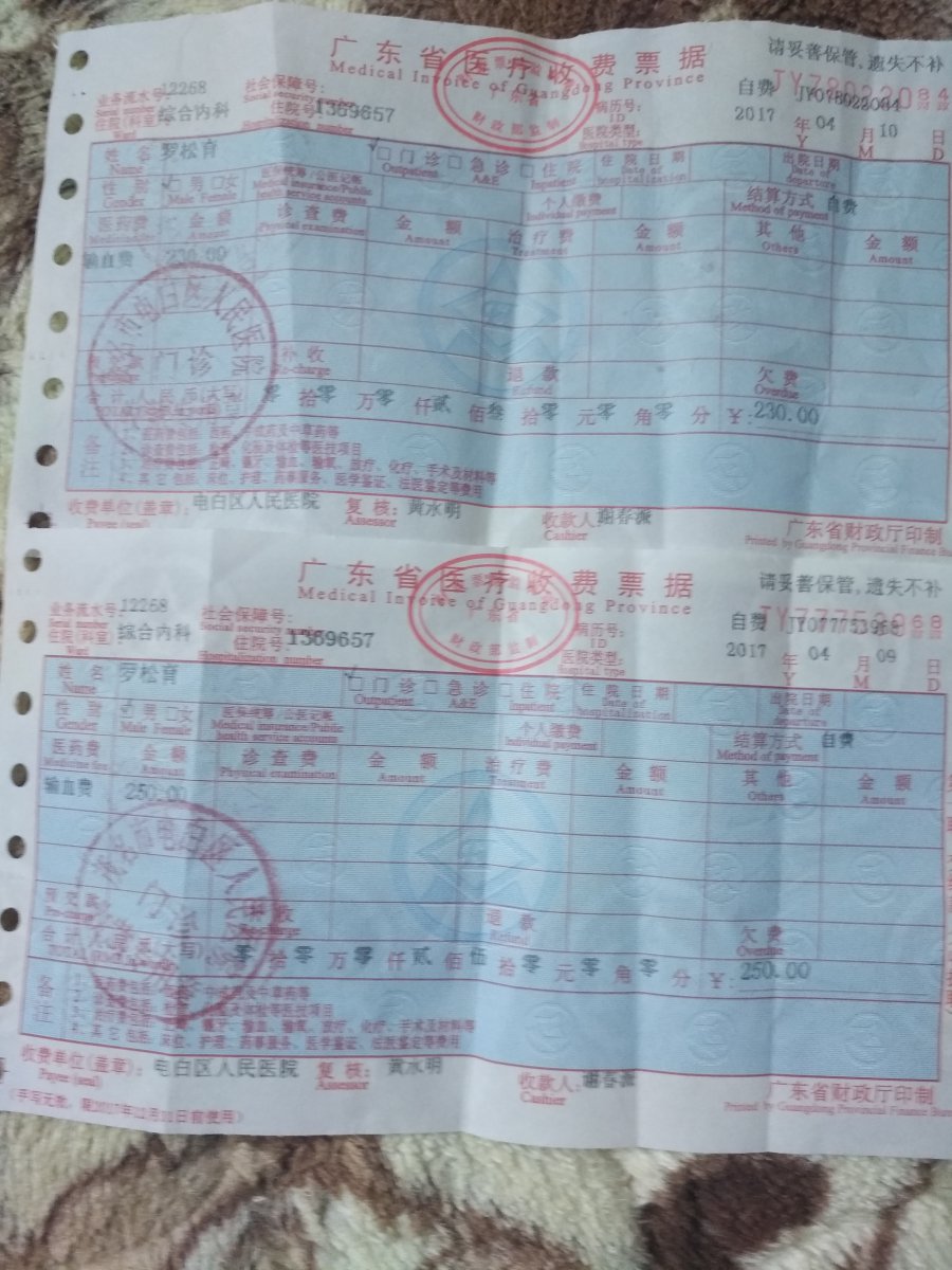 6、所谓的病情好转之说;除了我自费购买了四瓶白蛋白输了,经检验白蛋白有上升外,其它病情直线恶化,血小板由109→78→58→47下降,且己有皮下出血迹象。医生两要求ICU病会诊,并力劝送去lCU或转茂名、省医等,这就是所谓病情好转吧!!请有心者可到病房了解吧!!