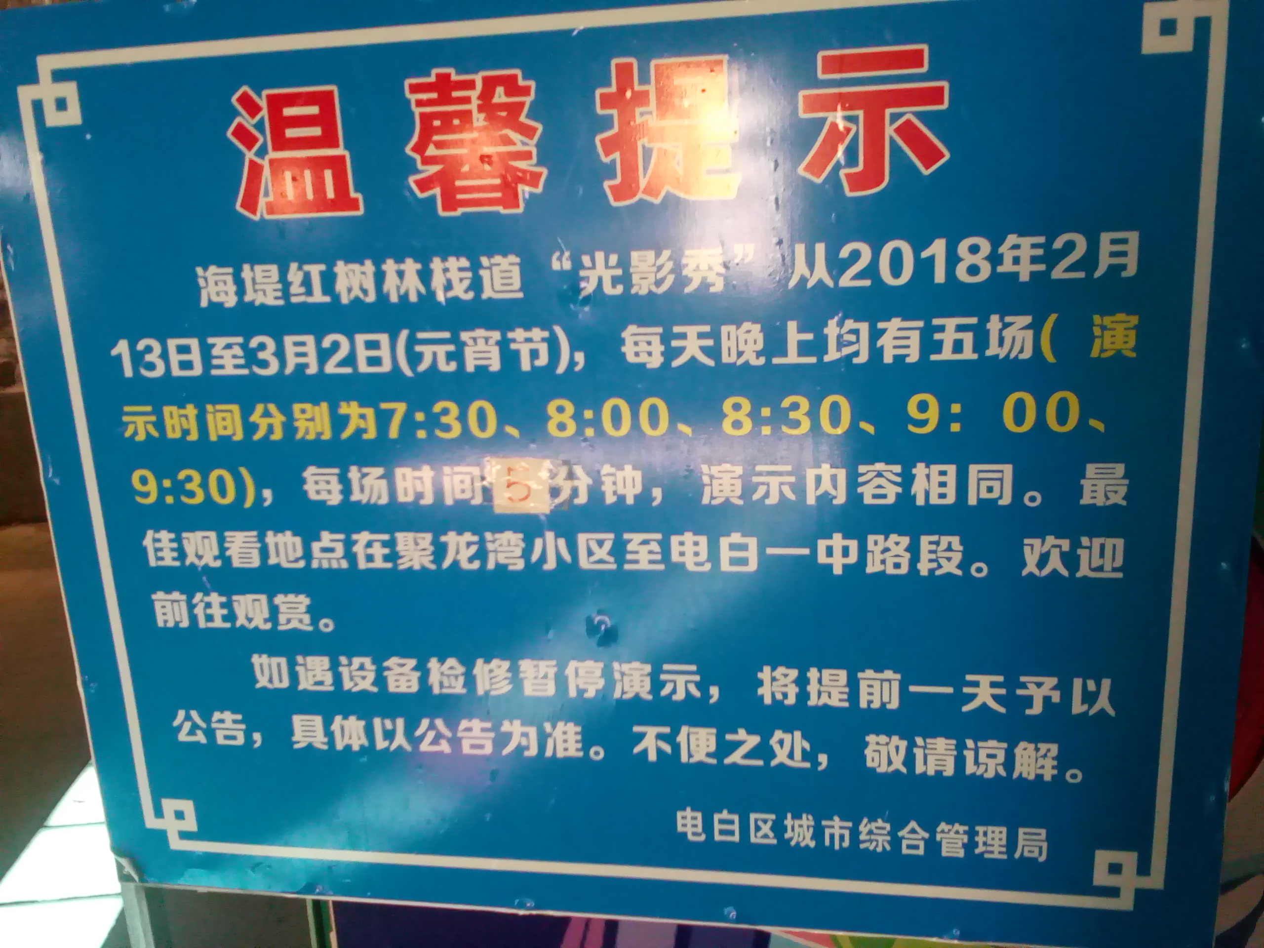 原又想过来吸吸人流,顺看有回程客婆,(不过人嘛貌似也暂不用多大质疑吧?),突然又想起貌似至3月2日什么的,或许那时俺一直只太关注人流等的原素,也木太过认真吸过这灯光秀的什么,就在那见一图示(应立在此有段时间了,图有点灰暗了,就按其指示,走去占个靓位,正面吸吸~Biggrin@2x