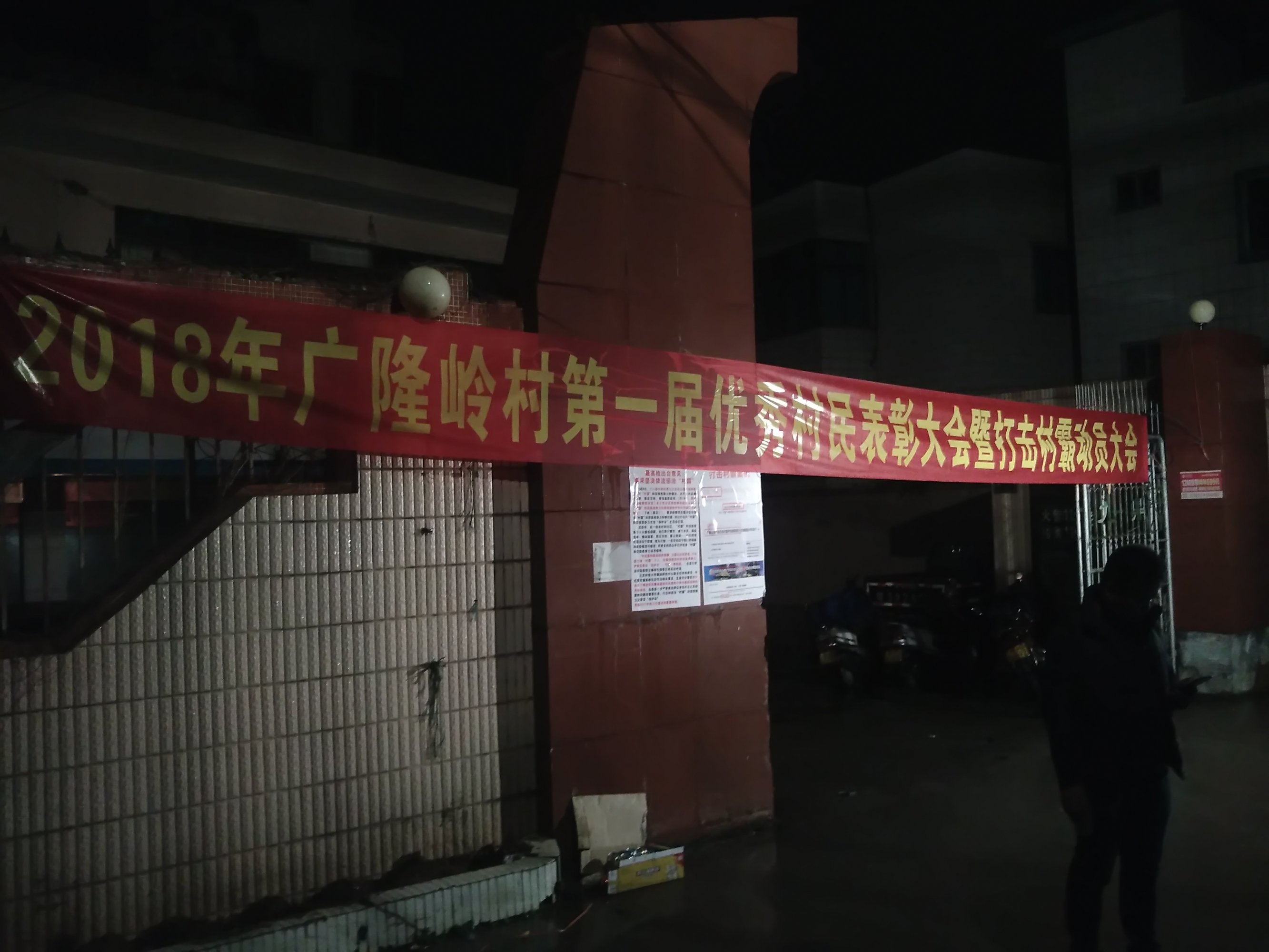 经过多次和村霸恶势力斗争,村民们都表现出冷静睿智,保持了0暴力冲突,坚持非暴力原则抗议不给社会和政府增加麻烦。广隆岭打击村霸表彰大会当晚召开,但天公不作美下着小雨,村民租来了雨棚拉上了电灯,简陋的音响也能发出最震撼的人心声。文明团结是广隆岭人的使命,这一切都会成为后代的模范。台上表扬台下掌声不断,花生米和啤酒把男女老少汇聚成一桌桌,年轻人穿战衣大合照,此情此景即使是台风来了也动摇不了村民打击村霸的决心。