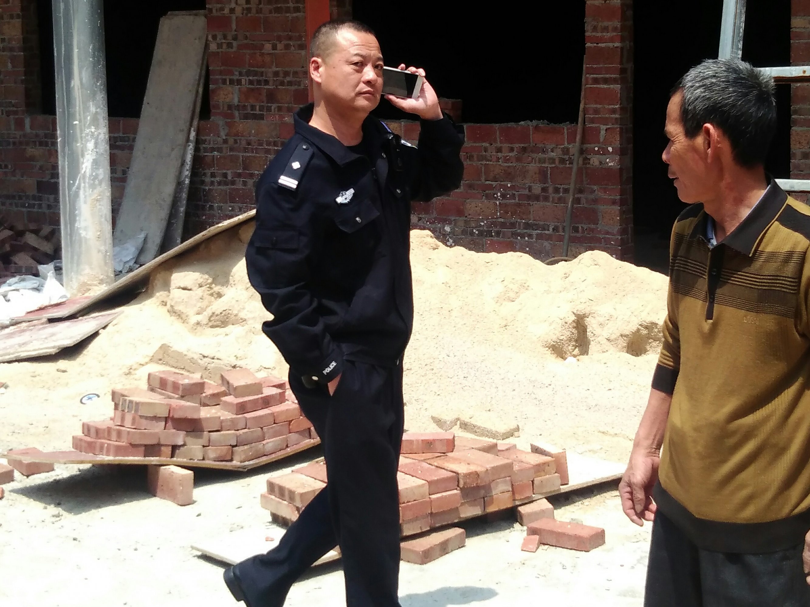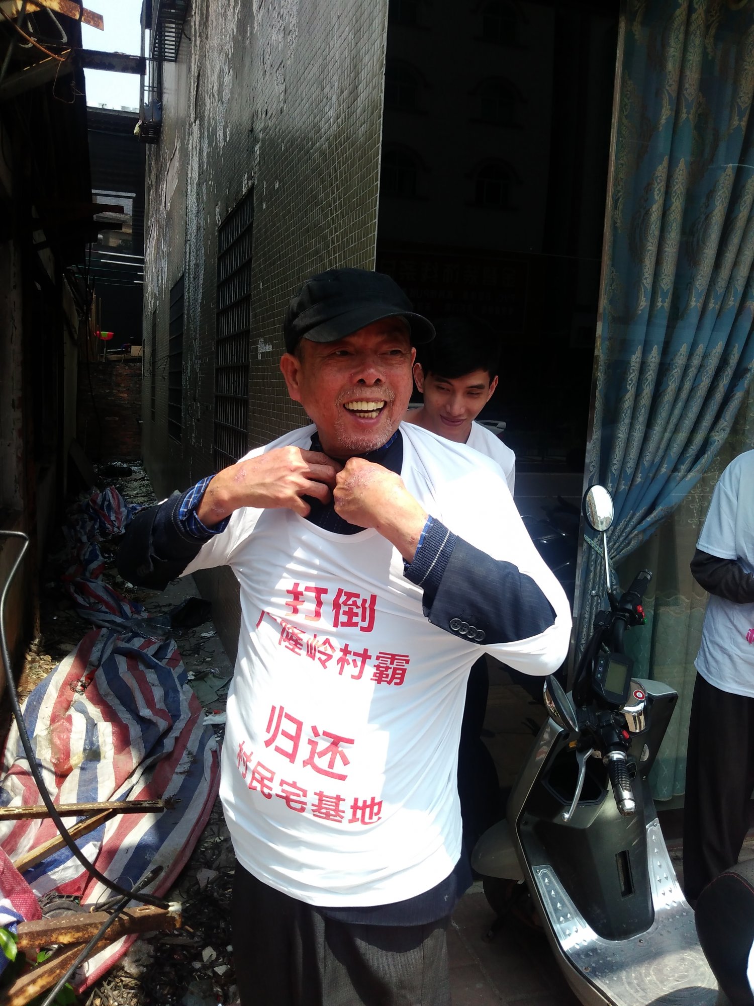 区政府承诺在3月底拆除,村民迟迟未见哪个部门有半点动静,那段时间里村委都跑烂几双鞋了吧。据说当时水东镇林涛书记对村委说是25号前拆除,村民乖乖地等啊等,盼啊盼,等到脖子长了终于等到月尾。或许大家都心中都早已有数,领导不守承诺已是家常便饭的事。每次都跟哄小孩一样,调皮了就给颗糖你尝尝甜头。只会拖字诀愚民对策,当然能拖到换届就是最好的。迫于无奈,村民准备再次到厂前路抗议,可这天上午就有派出所人员来到了村中,看来风声传的挺猛,早早派人来保护村民真是用心良苦。村民们像往常一样过去宅基地处拉横幅抗议,个别警察在周围巡视护航,有人拍到领导都在百米开外的马路对面,难怪迟迟未见他们出现,是心虚还是肾虚众人不得而知。