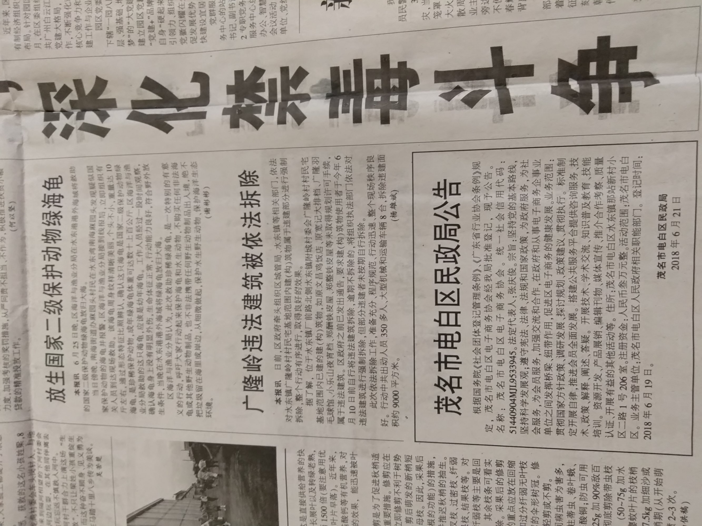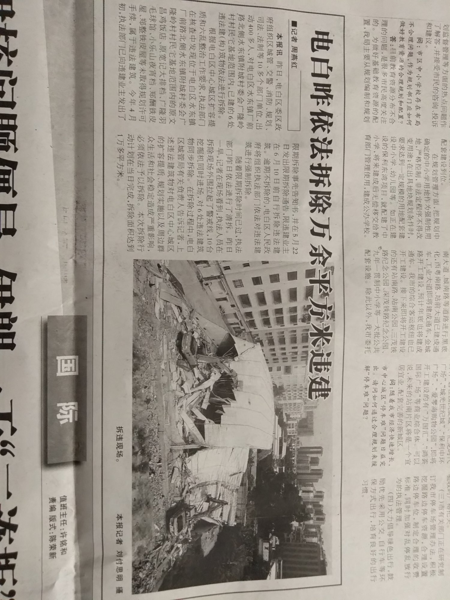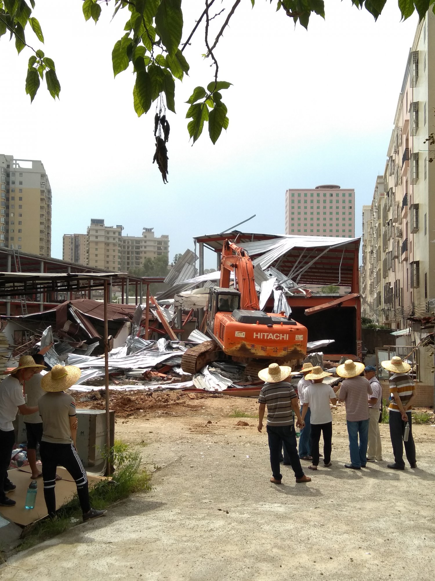 电白区人民政府组织多个相关职能部门,联合出动三百几人对厂前路北侧广隆岭宅基地违建进行依法强拆。补充声明一下,在新闻播报显示动政府用了大型机械和运输车8台,拆除大规模违建6处,实际只拆了4处,有夸张虚报实事之嫌,拆违主要包括有(文昌鸡美食城、瑛姑食庄、小乐山夜宵档、广隆羽毛球馆)。
