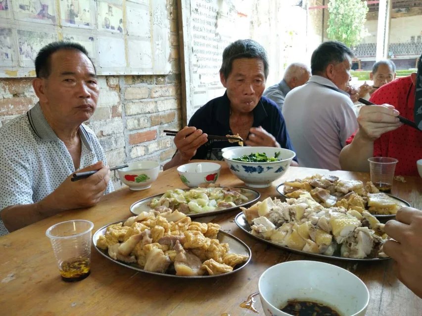 我们来到冼公祠参观,冼姓的后人很淳朴,厚道,对我们十分热情。图为高州市长坡镇冼绍胜(左)与冼庆杰在冼公祠(右)两人招待我们吃饭,主菜鸡是当地的土鸡。