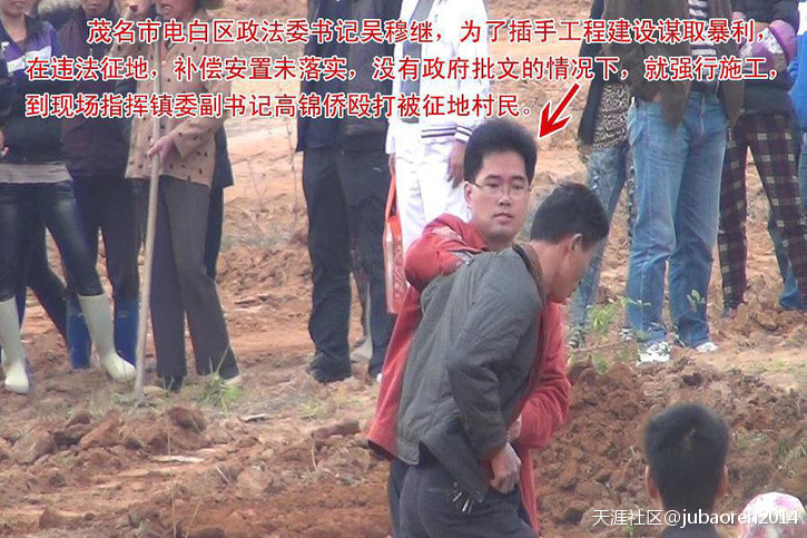 三、被举报人吴穆继任区政法委书记兼司法局长,沙院镇书记期间,为了插手每块被征收土地的工程建设谋取不当利益,不顾国家三令五申,在涉及征收土地的每个地方和角落,吴穆继都利用人民赋予的特权,动辄指使黑社会参与征收土地并殴打被征地农民(附照片),利用公、检、法在每块被征收土地实施强制拆迁,更加野蛮的是指使人民法院枉法裁判,引发国家赔偿的不良现象,造成社会不安!