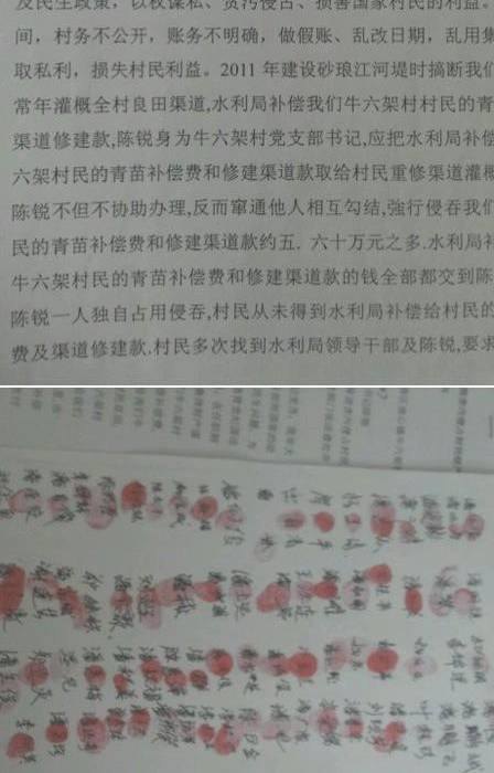 牛六架村委会各个村庄都悬挂着要求发现村委会公开帐务的标语、条幅。据走访的群众反映,。前任村官陈锐任职十多年来,侵墨贪污侵占公款,冒领国家补助,。涉及款项达三四千万元。 据不完全统计:群众反映前任村官陈锐问题有如下几项: