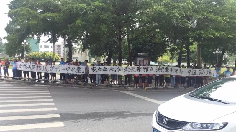 电白一中全体老师,汇集在区政府门口,拉起了横幅: