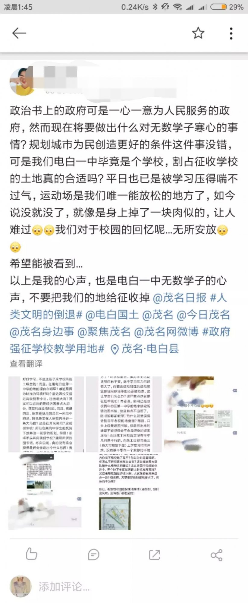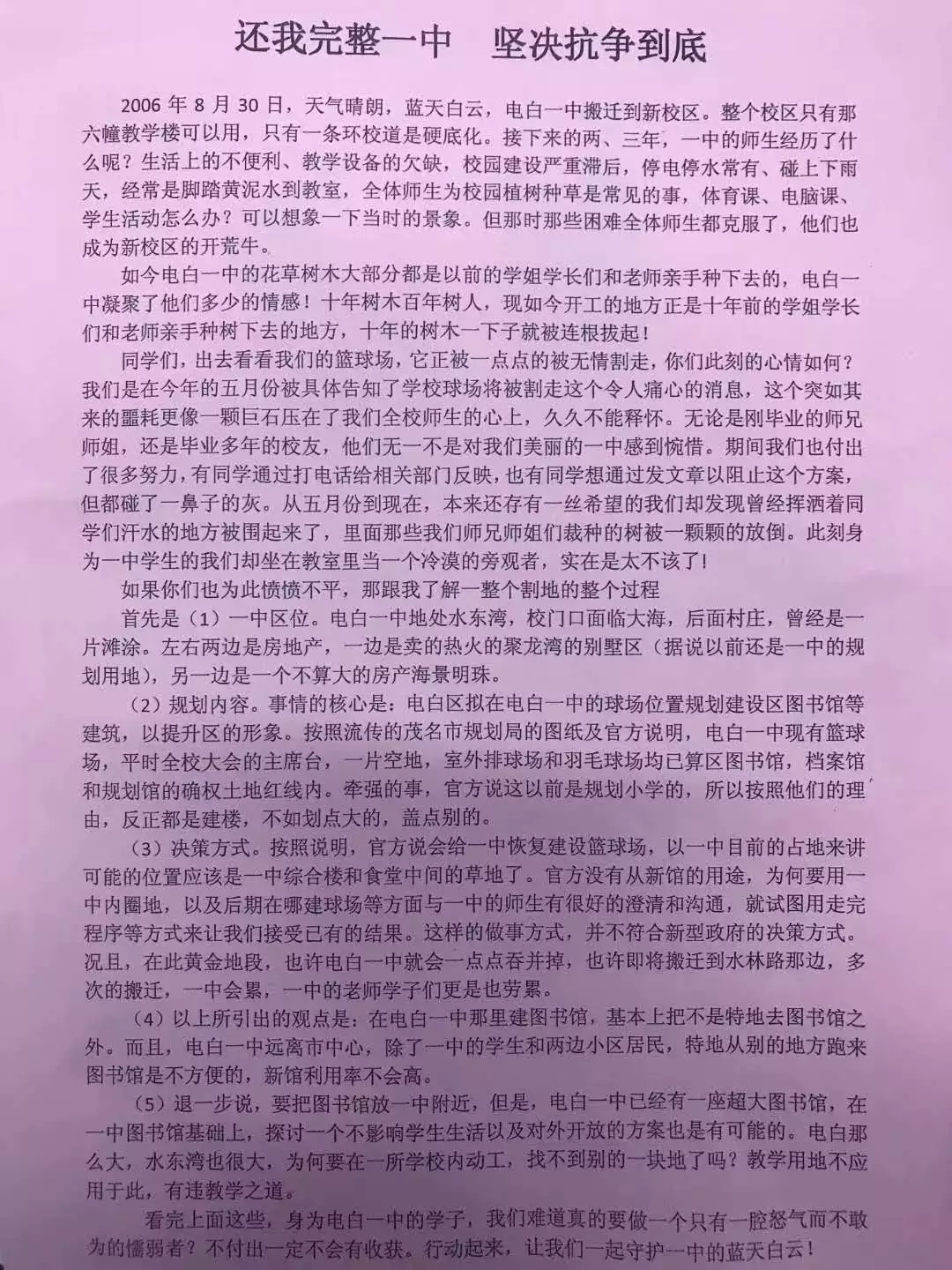 我不明白,电白之大,何处不能建三馆,非割我一中运动场?我不知道,历经三次被割地的一中下一次是否会被强制搬迁?我不知道,电白一中的命运会在何方,电白教育的出路又何在何方