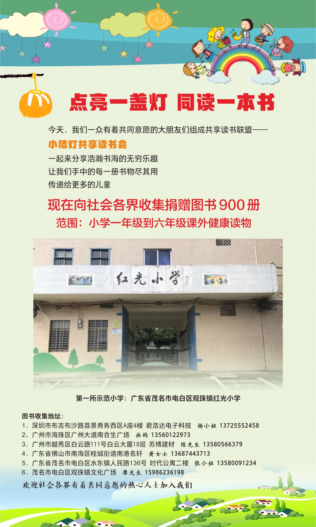 关爱乡村小学生的成长,小桔灯共享读书会现向全社会募捐小学生读物。现已集满2000册,但还远远不够,期待您的参与,一本书,一份爱。