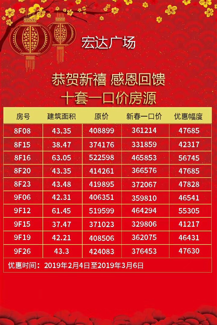 宏达广场优惠大放送 优惠一:总经理特批10套优质房源,享受1万抵一口价特惠,单价最低7388起! 优惠二:由宏达战略合作单位介绍成交的VIP客户可享受赠送两年物业管理费! 优惠三:到访有礼,元宵节前后到访,即赠送精美礼品一份! 注:北岸中心区,37-63㎡小面积学位房,首付9万元起,赶紧过来参与团购吧! 团购热线:400-750-8888转94016