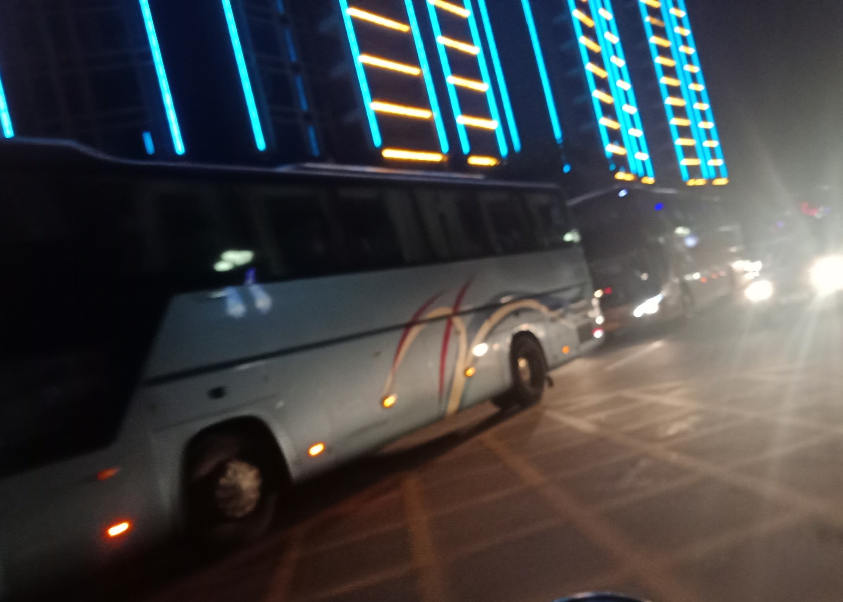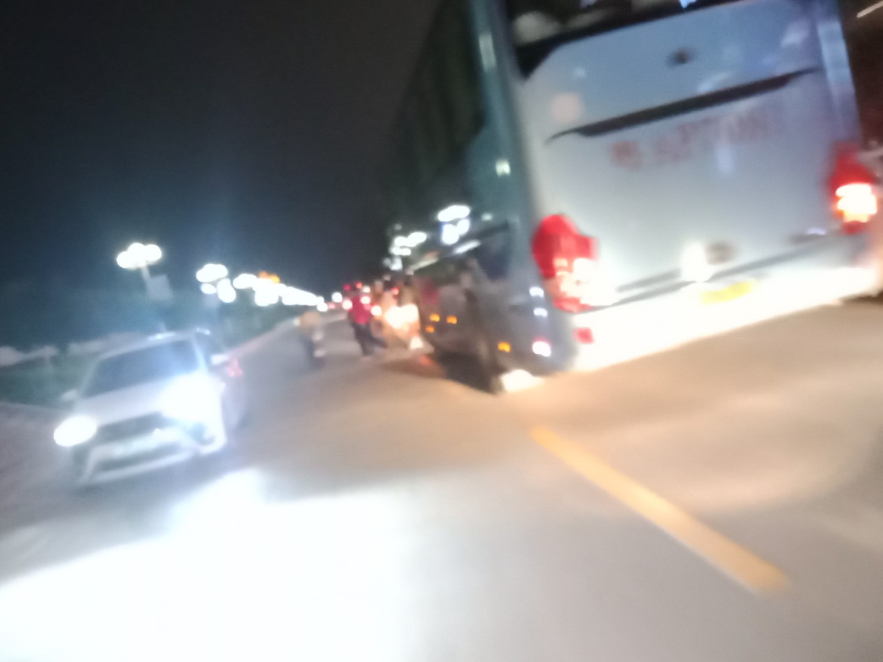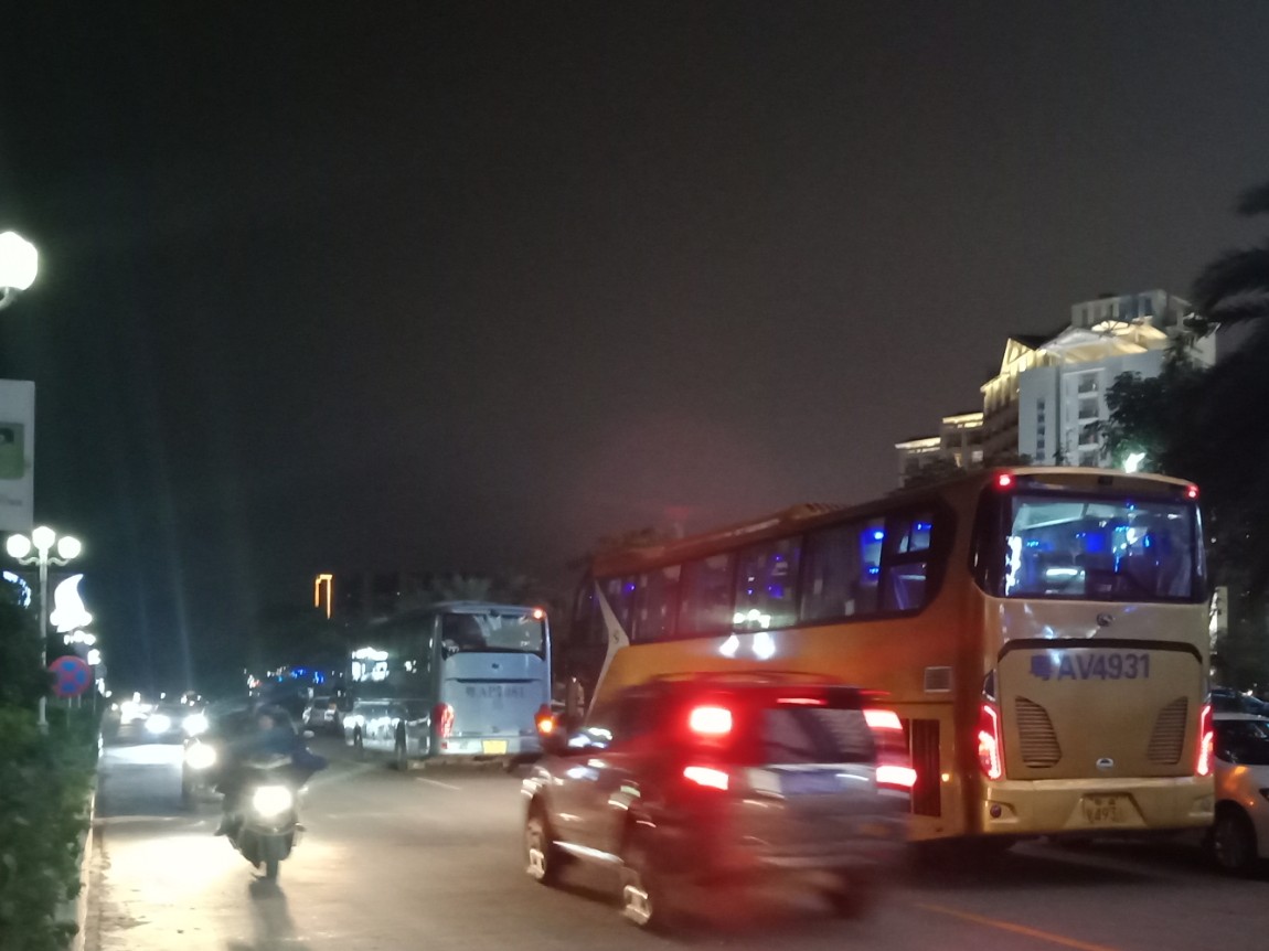 今晚星期五7点几钟,又想去东湖吸吸7点半钟的光影秀(还有场8点半的.还有明晚星期六的两场),驾摩出时有微微雾雨,人群虽少许多(可能是有雾雨吧?),但徒步群众都有好些(有些拿了雨伞),见还没开始,就驾摩过栈道那边吸吸,忽见有几辆游巴从海滨大桥那边方向开来,并停靠在亲水平台这边停下,并从游巴上走下尊贵的远方游客~