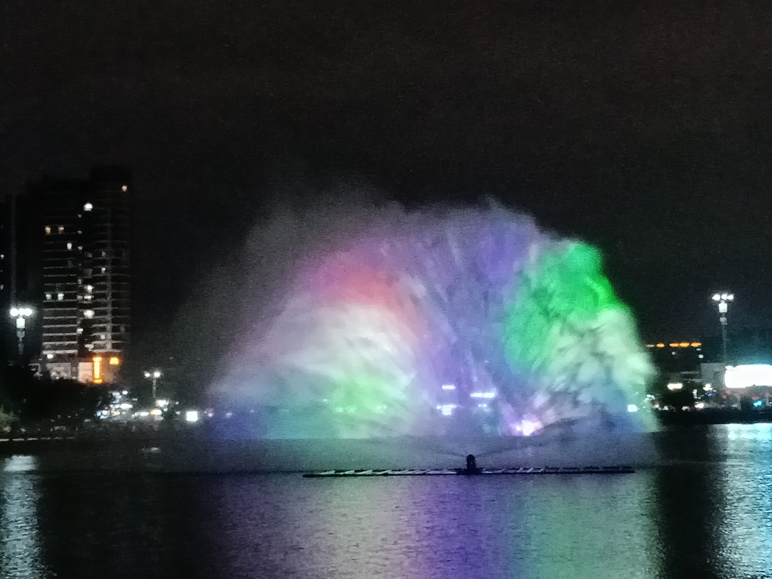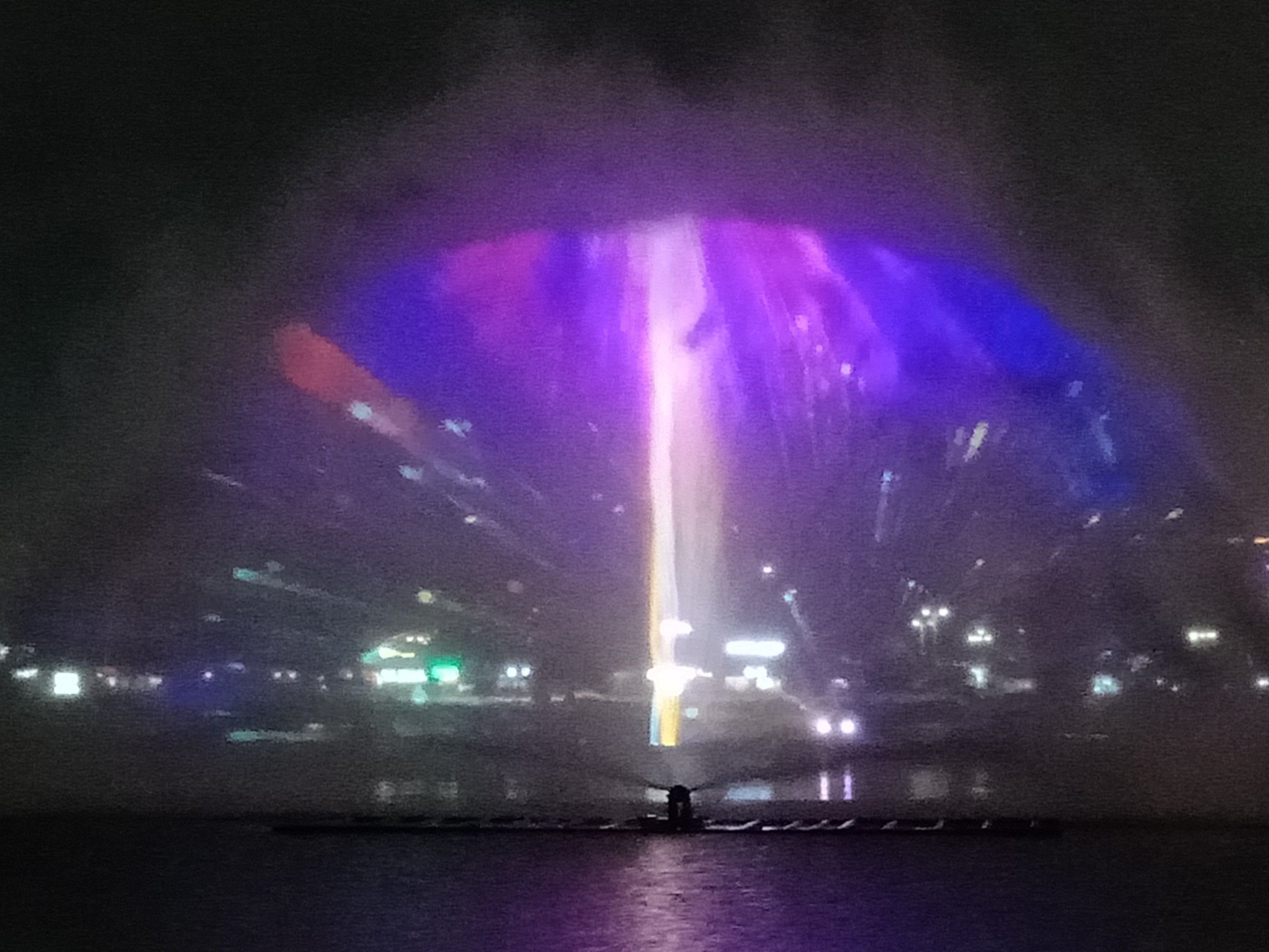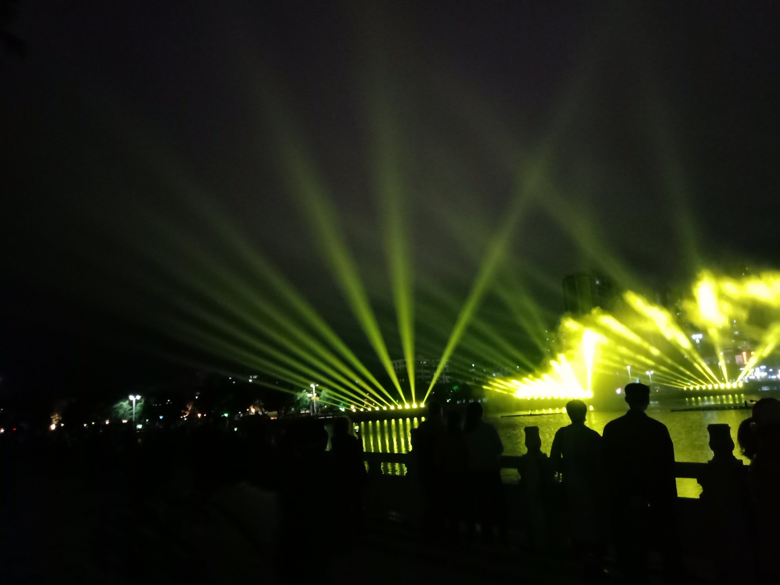 在这说下,貌似有些情节与先前的有点变化出入与改进了些,虽湖堤边有好些人围着,但相对节前,人没那么多了,但人群也还可以,(或天气等问题?),选择站的位置也好许多,况且看那水雾投像也清晰明亮~许多,不过风有点大吹得水雾有点散偏斜等,不过现场看了算行,但瓦手机拍得不行~这以上只是个人见解所观,或瓦感观观赏力不行吧,亲临其景的现场观众群众说好才是好吧?