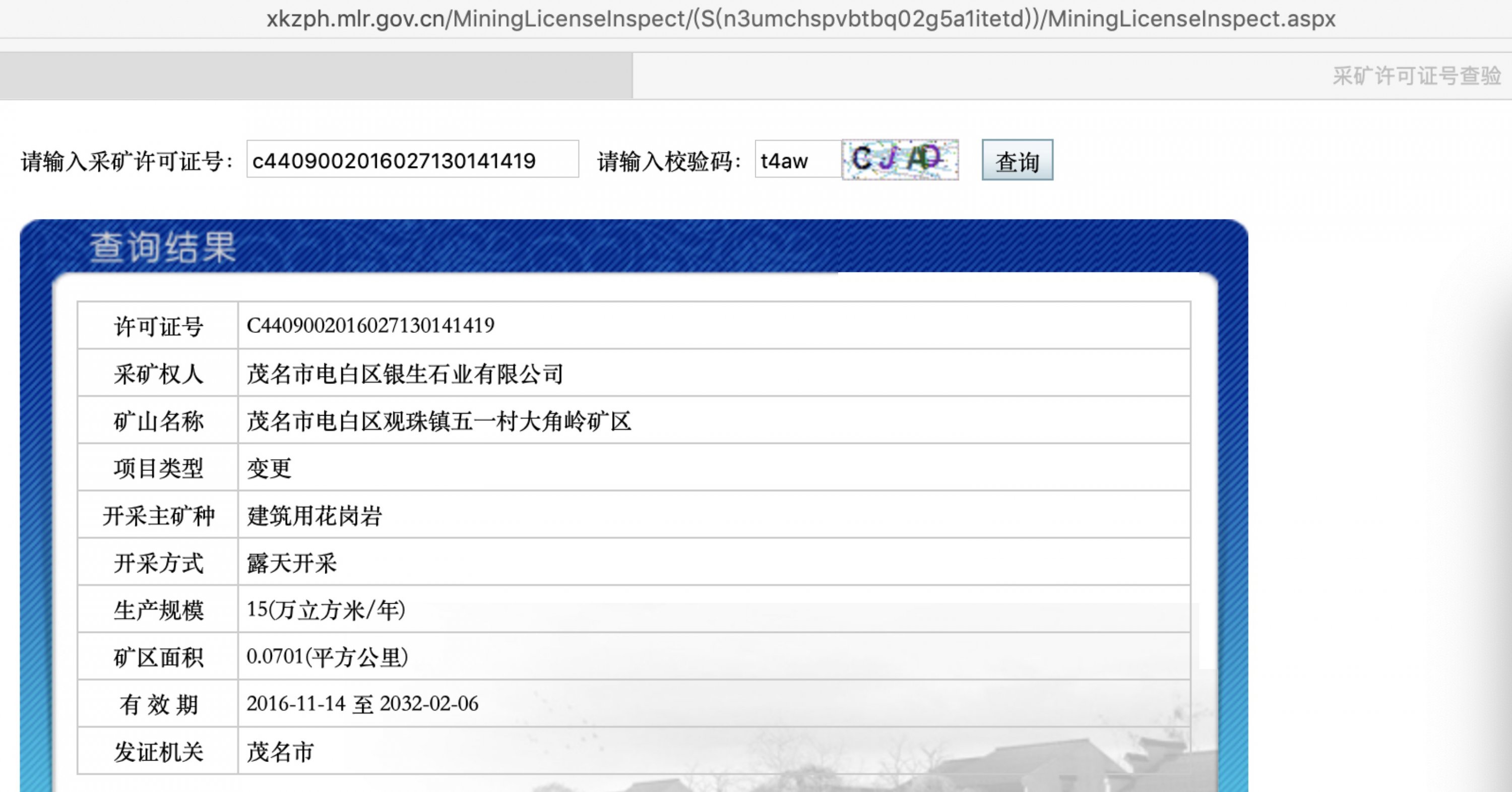 根据查询得到的相关资料,茂名市电白区银行石业有限公司拥有相关许可文件,可以对我们的大角岭进行花岗岩开采,但拥有了开采权是否就表示可以无限度的破坏我们的生存环境呢?