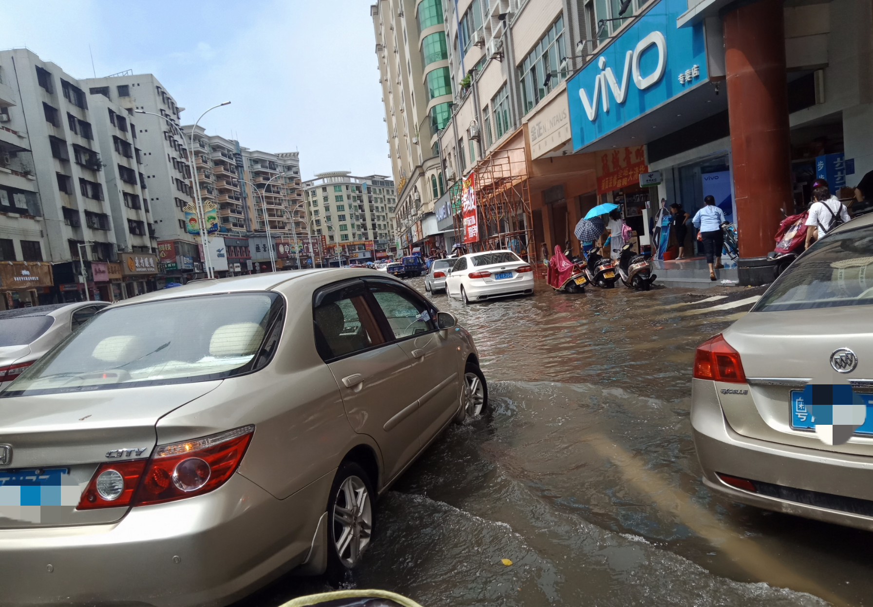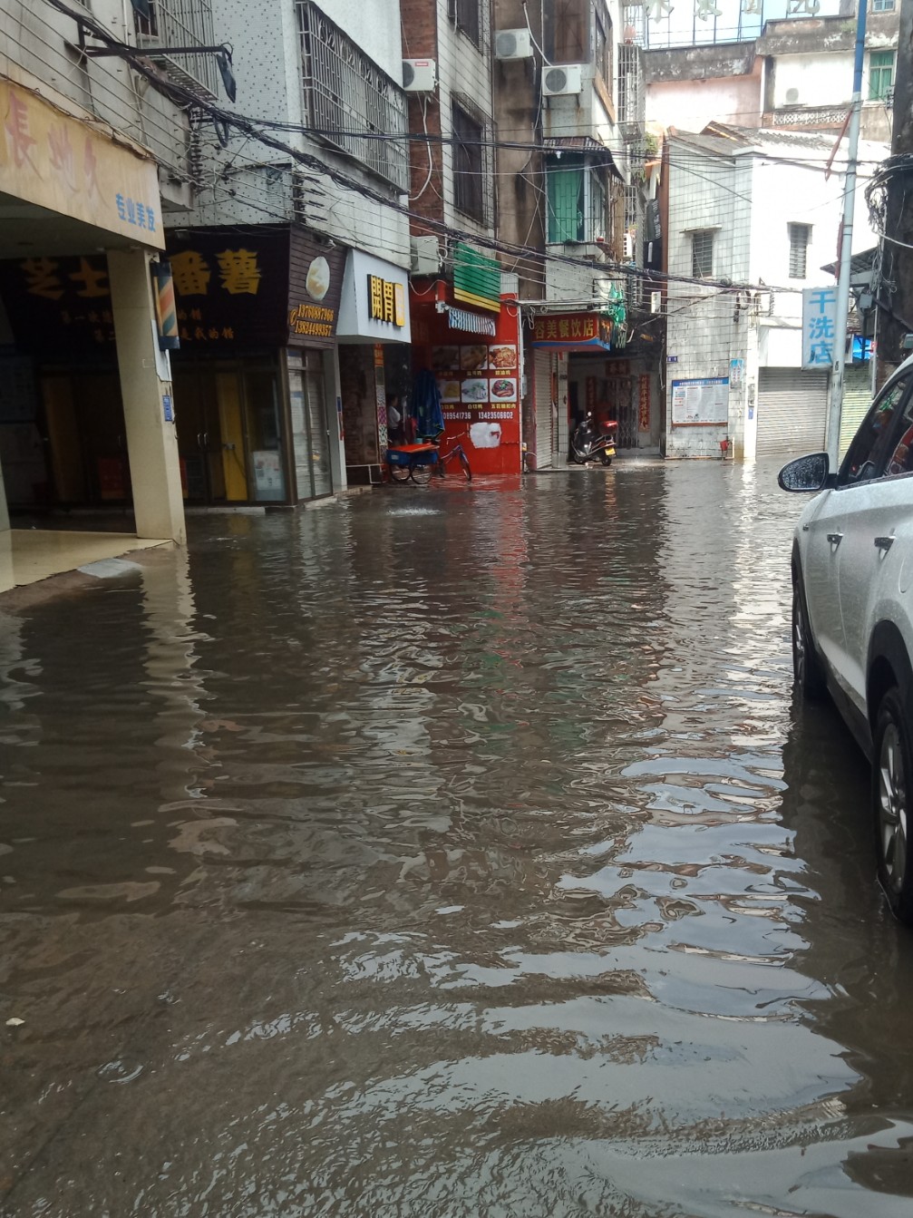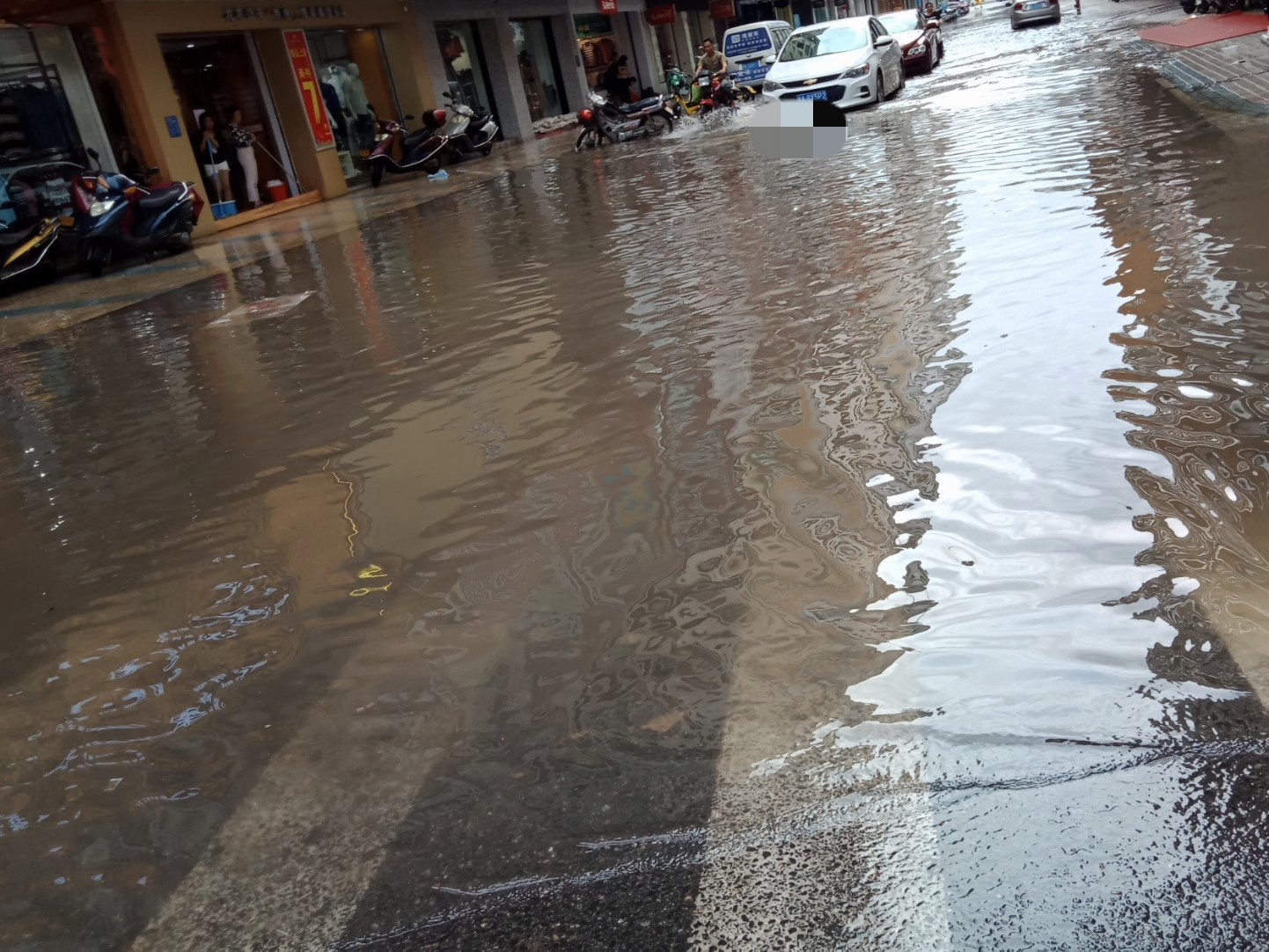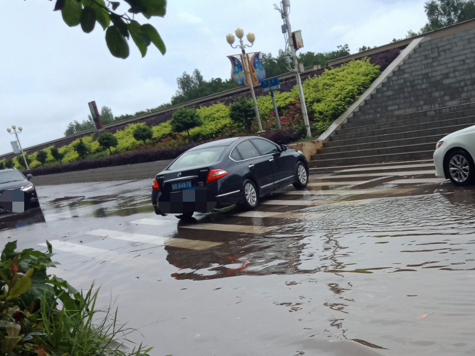 诚荟酒店门前的凤凰大道成了黄河,有一辆小车死火。