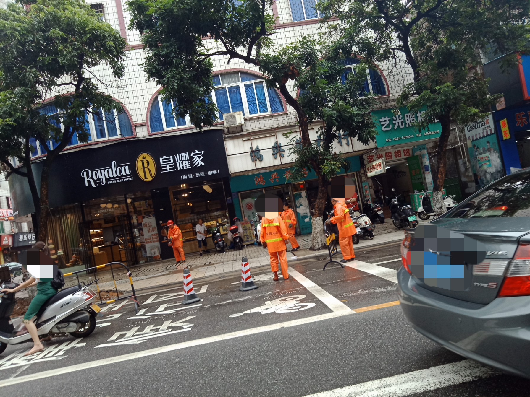 见有工人在剪树~又走入貌叫打铁巷?有水排不走现像,但积水不算深~摩托轻易而过~