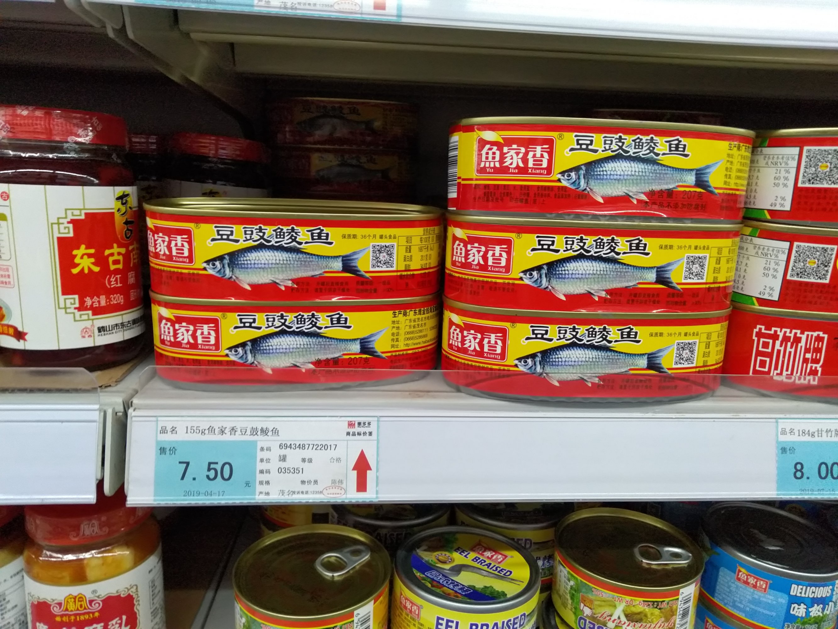 逛坏多多超市看到某厂牌罐头鱼是电白产的,就想着体验下电白企业的产品,为支持下本地货就买了盒,然后又买了个甘竹牌的回去对比味道。买单时发现价格不对,为了证实我是不是老眼昏花于是我又回到货架看了下,结果货架放的克数货不对板,把价格高的放放到价格低的去了,这样感觉很不好,稍不留神是不能发现的,这种情况去服务台估计也是说员工摆错了之类的话,最多叫退钱什么,算了,这种情况发生太多次了。这盒本地豆豉鲮鱼口感偏硬,跟甘竹口感相比还是很大区别,希望本地企业再接再厉做得更好。浏览附件332299 浏览附件332296 浏览附件332297 浏览附件332298