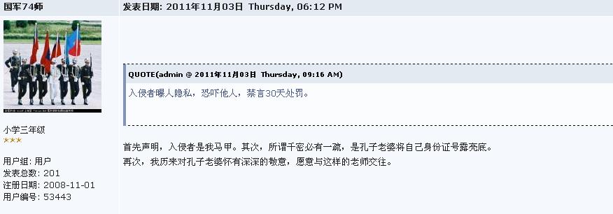哦,原来如此。难怪我总感觉它阴声怪气的。入侵者就是国军74师,应该是在体制内工作的。此人拿着财政工资,爱的是中华民国,爱的是国民党,对共产党政权是有刻骨铭心的恨,它要外国鬼来殖民中国200年,要美国的战斧导弹来炸中国。牛精英雄就是它另一面的化身马甲,专门用来辱骂网友的,满嘴的生殖器,横行论坛N年却鲜见受到惩罚,好生奇怪,让人联想翩翩。