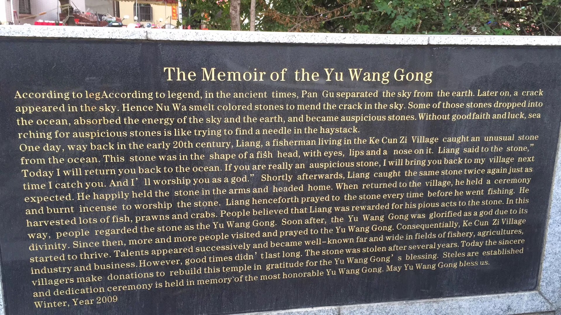 译全了吗?这应该是一座神庙的传说,不过,我怀疑在造假,如果用中文写,村民立刻就会说,车!假的。写成英文,村民看不懂,等从外国传回来的时候,村民就会说,原来我们村这座庙还有这样的来历。从这一点看,我们的百姓要比高州的诚实得多,高州想到什么,张口就来,也不见百姓驳斥。简单看懂几句