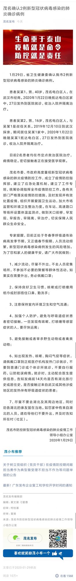 茂名确认2例新型冠状病毒感染的肺炎确诊病例