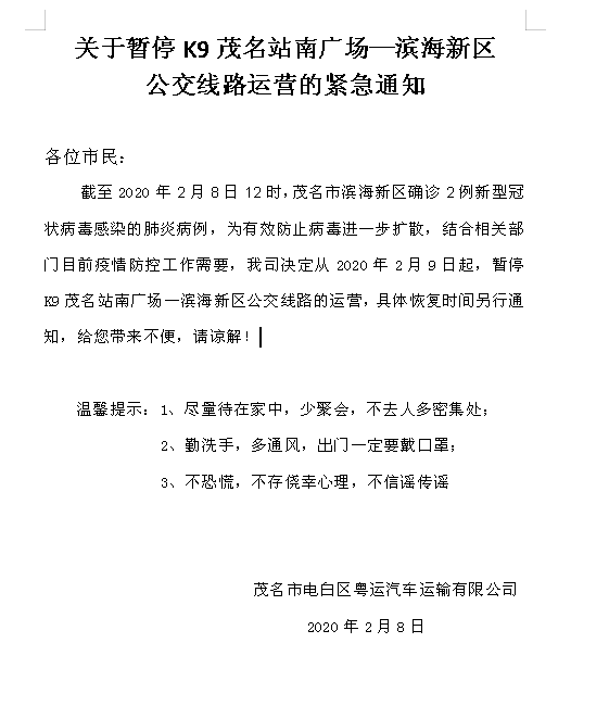 各位市民: 截至2020年2月8日12时,茂名市滨海新区确诊2例新型冠状病毒感染的肺炎病例,为有效防止病毒进一步扩散,结合相关部门目前疫情防控工作需要,我司决定从2020年2月9日起,暂停K9茂名站南广场—滨海新区公交线路的运营,具体恢复时间另行通知,给您带来不便,请谅解! 温馨提示:1、尽量待在家中,少聚会,不去人多密集处; 2、勤洗手,多通风,出门一定要戴口罩; 3、不恐慌,不存侥幸心理,不信谣传谣 茂名市电白区粤运汽车运输有限公司 2020年2月8日