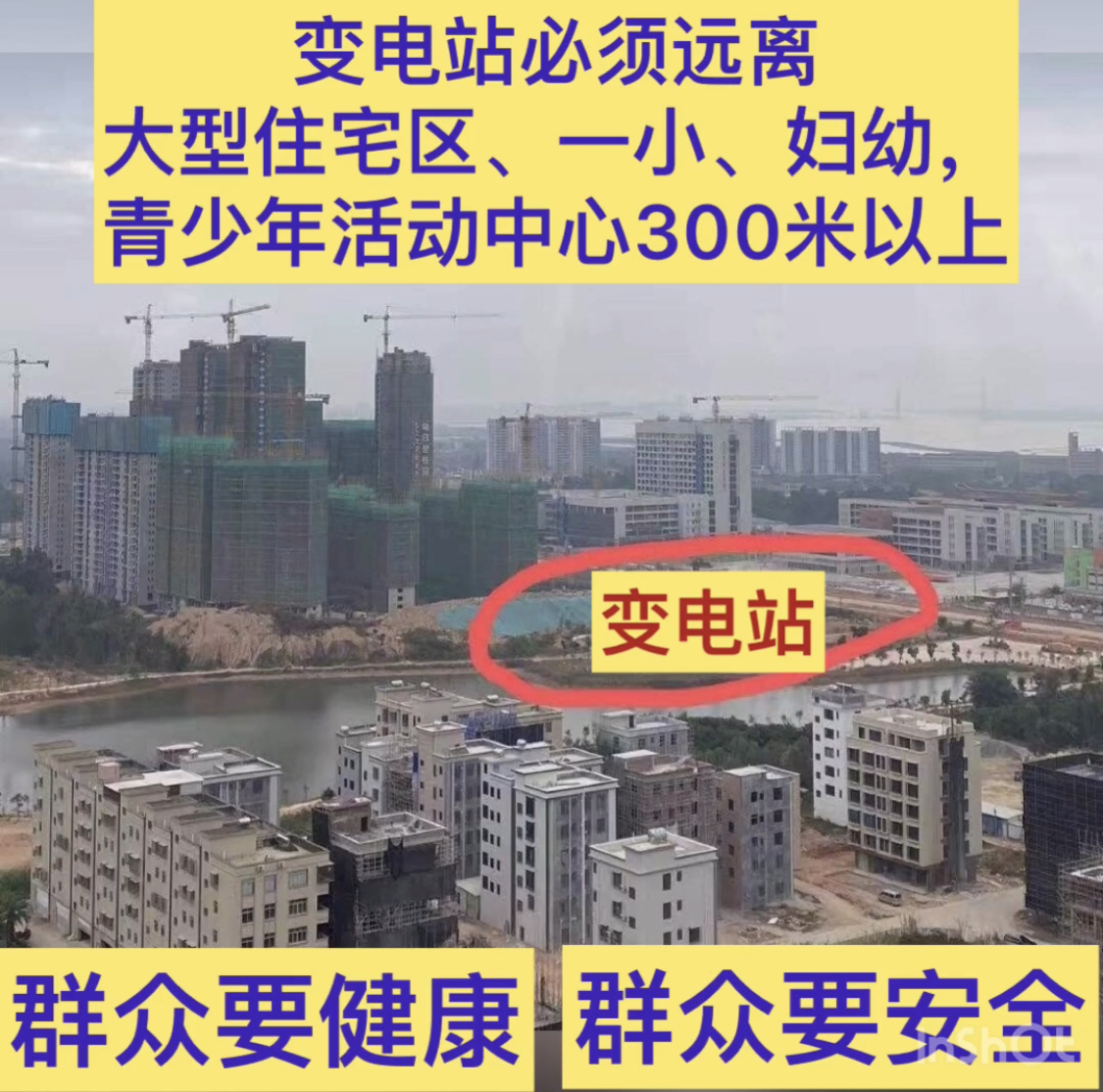 要健康,要安全,变电站要远离电白一小,青年活动中心,妇幼保健院,凤凰大道,大型住宅区等人流密集地300米以上。