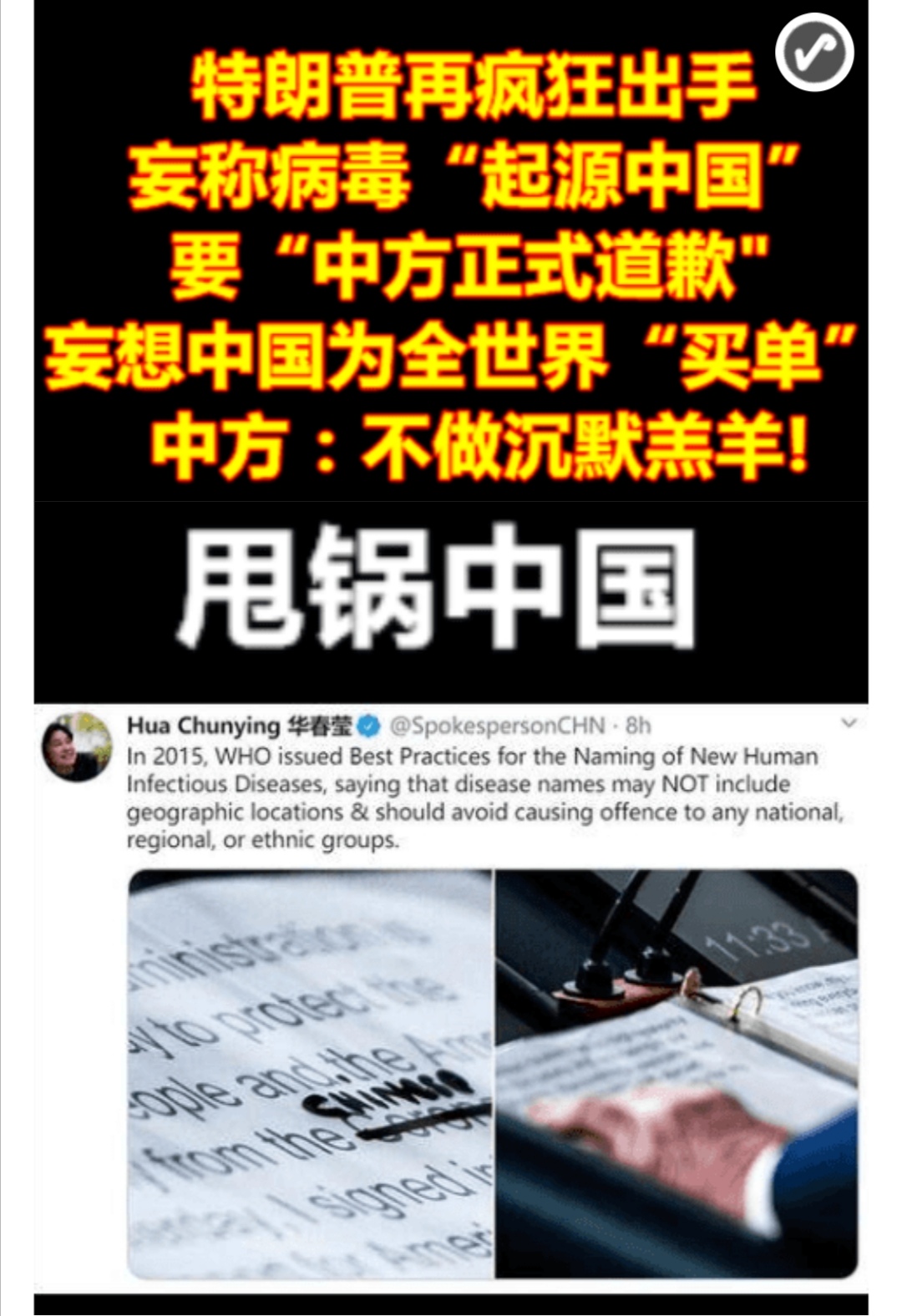 外交部发言人 耿爽:世界卫生组织已经就新型冠状病毒作出正式命名。个别美国政客不尊重科学,不尊重世卫组织的决定,迫不及待借新冠病毒对中国和武汉污名化,我们谴责这种卑劣做法。