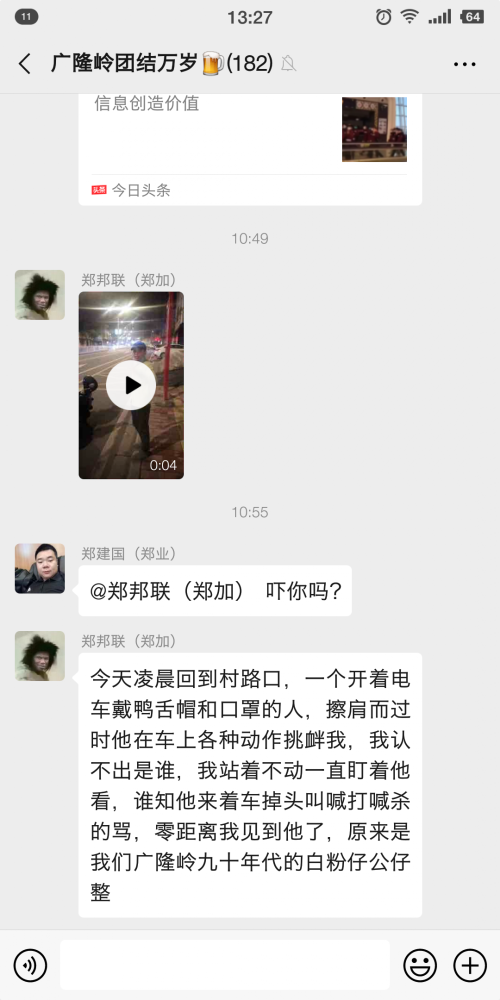 广隆岭村 小学四年级 注册 2018-07-28 消息 268 反馈评分 65 点数 11 2020-03-21 #14 OK100 说: 好像很厉害的样子。到底有没有打起来呀? 唉,你们村!!!!!和气生财呀! 点击展开... 不知道有没打起来,从截图中看到郑邦联呼吁大家不要动手应该是勇敢冷静的,也希望村里村以外及其他人也小心提防这种人。