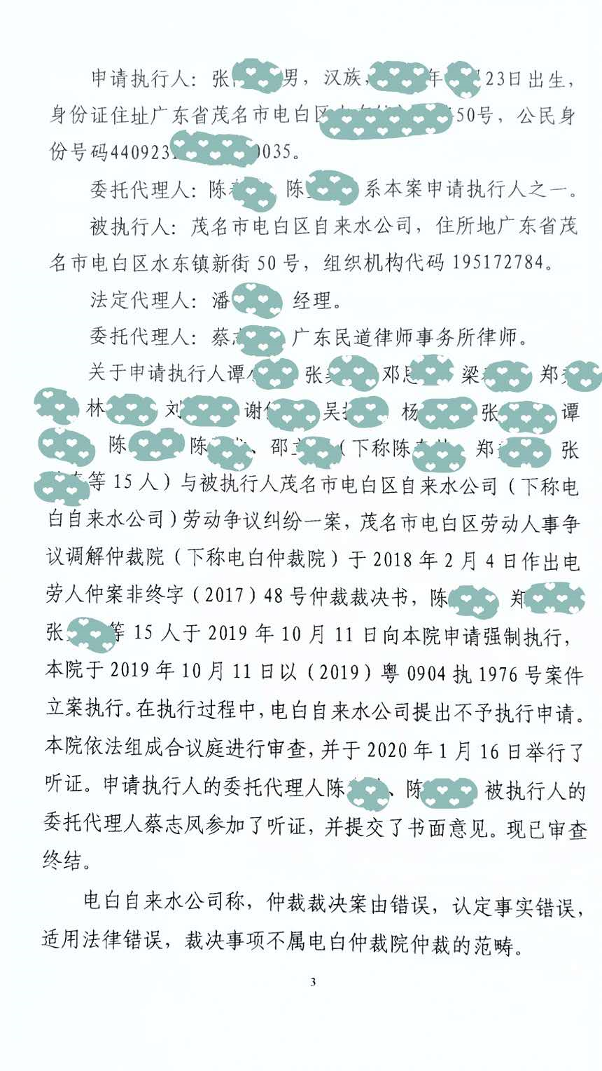 我们是电白区自来水公司的可怜的职工。都是事业编制身份,自来水公司也是公益性第三类事业单位。从1998年开始以经营困难为由拖欠工资到如今。我们多次上访无果!其中自来水公司也做出回复,单位困难无法一次性支持,等死后由家属申请,再考虑一次性返还。这么荒唐的书面信访回复书,竟然是一个国家单位作为违法拖欠职工工资的回复!!由于我们收入无法维持生活被迫向劳动人事仲裁庭提出仲裁。仲裁支持我们的诉求。单位不服向法院起诉,电白法院判决维持仲裁裁定。自来水公司又向茂名中级法院提出起诉。提出我们的事业编制的身份欠薪不属于法院管畴范围。在自己作出信访回复书等证据面前也不承认欠薪。中级法院发回电白法院核实我们的身份。电白法院竟然在劳动法明确规定:事业单位,劳动报酬属于劳动人事仲裁处理。而做出不属于法院管筹范围。驳回自来水公司的起诉。而自来水公司在起诉有效期放弃提出起诉。那我们在律师指导下向法院申请强制执行。在封帐划帐回法院后。自来水公司又以劳动人事仲裁庭无权作出仲裁为由向执行局提出不予执行。而执行局却又采纳了,由三个执行庭长组成合议庭,越权做出不予执行决定。根据劳动人事争议仲裁庭办案法则第一条已明确规定事业单位,劳动报酬属于仲裁处理的。也有法律规定在劳动仲裁结果出,有效期半年内向中级法院提出推翻。但即使各条法律明确规定下。执行庭竟然对各条法律视而不见违反规定作出不执行已生效的劳动仲裁裁定!!所有律师都感到气愤!这根本就有无视法律!!面对这个不公平!我们一面信访,一面向纪律反映!结果都是不了了之!!各部门串通一气!!法院把我们推向一个死循环!!我们走了二年几的诉讼之路,现在又让我们重新起诉!!我们每个月拿着二千几元的工资真的无法维持生活。现在单位又给政府承包给北京首创集团,我们将又面临下岗。我们真的走投无路了只有借助媒体的力量!!希望大家能帮帮我们!!希望大家转转发各大论坛。万分感谢!