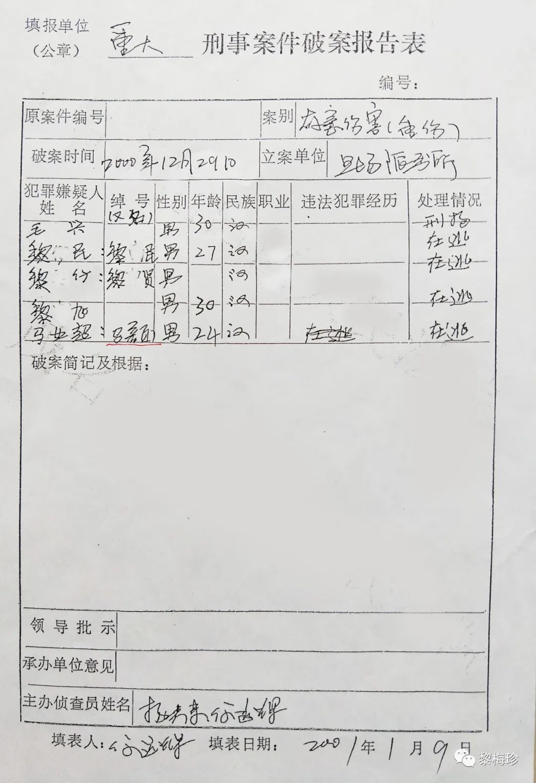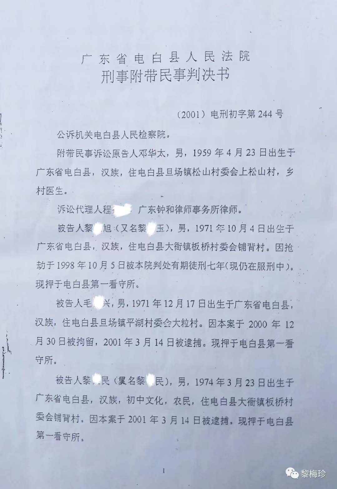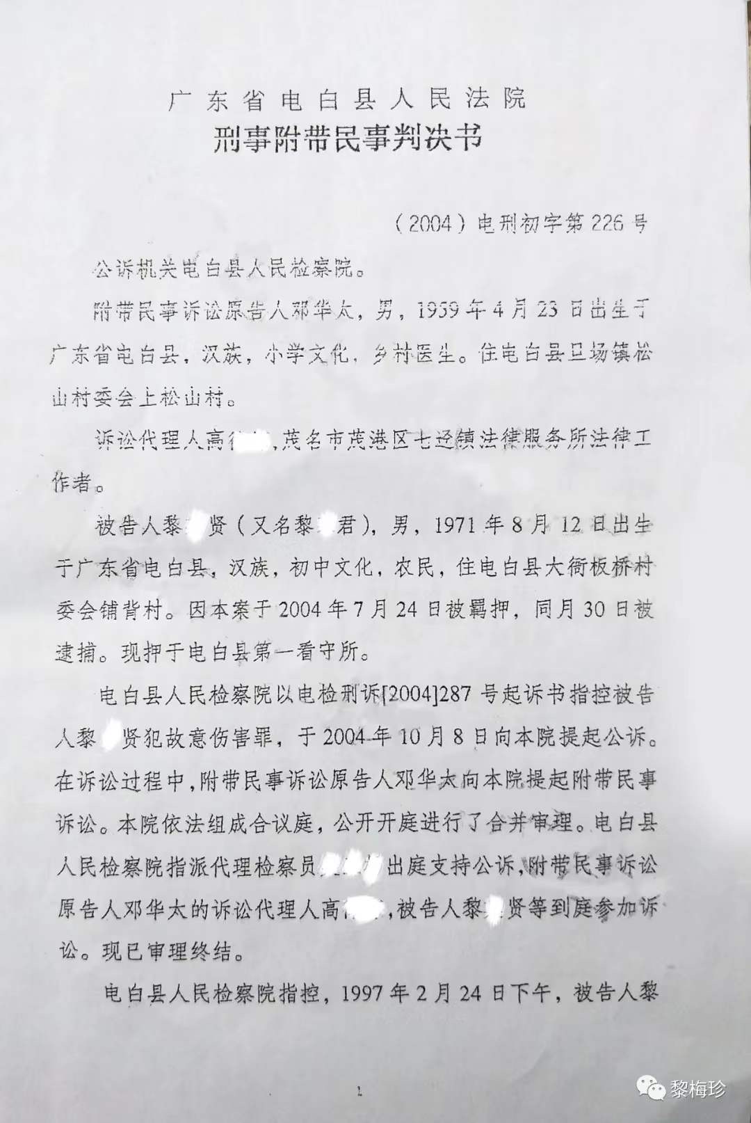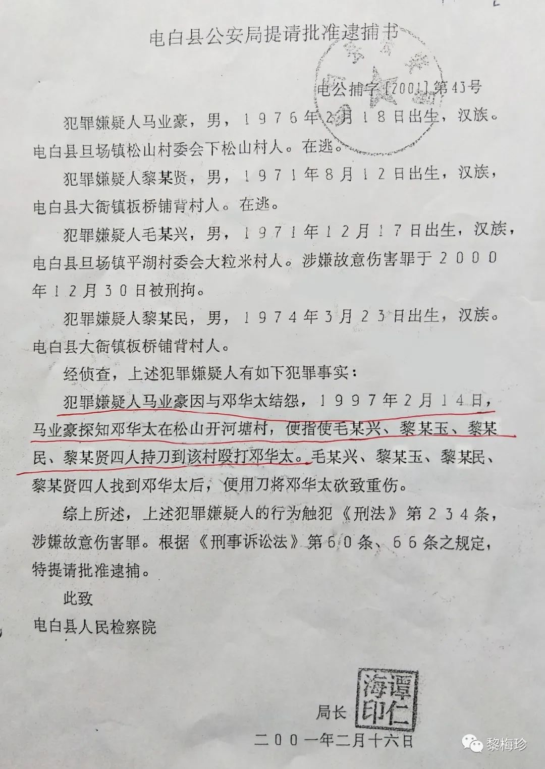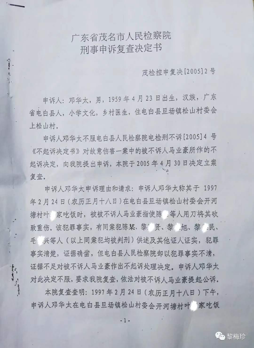 1997年2月24日,马业豪指使黎某旭、毛某兴、黎某安、黎某民(此4人已科刑),马某某、马某某、陈某某等人,用刀、枪、铁管等作案工具,凶残地把我丈夫邓华太的手砍断,重伤致残后无钱医治导致死亡,后附《电白县人民法院判决书》该案在当地曾轰动一时,搞得当地群众人心惶惶,虽然案件发生后公安机关抓获了部分涉案人员,但作为主犯的马业豪却一直没有捉拿归案,其原因主要是仗着财大气粗的姑丈谢忠文(原电白县七迳镇木等村委会书记兼主任)的保护。