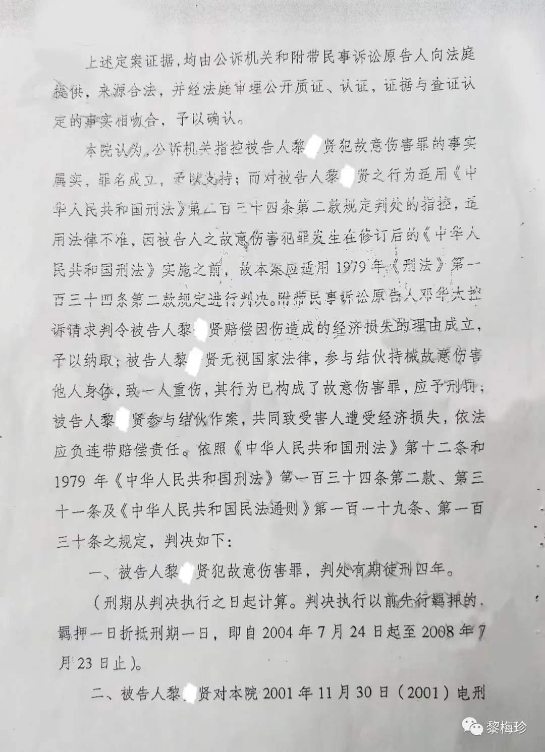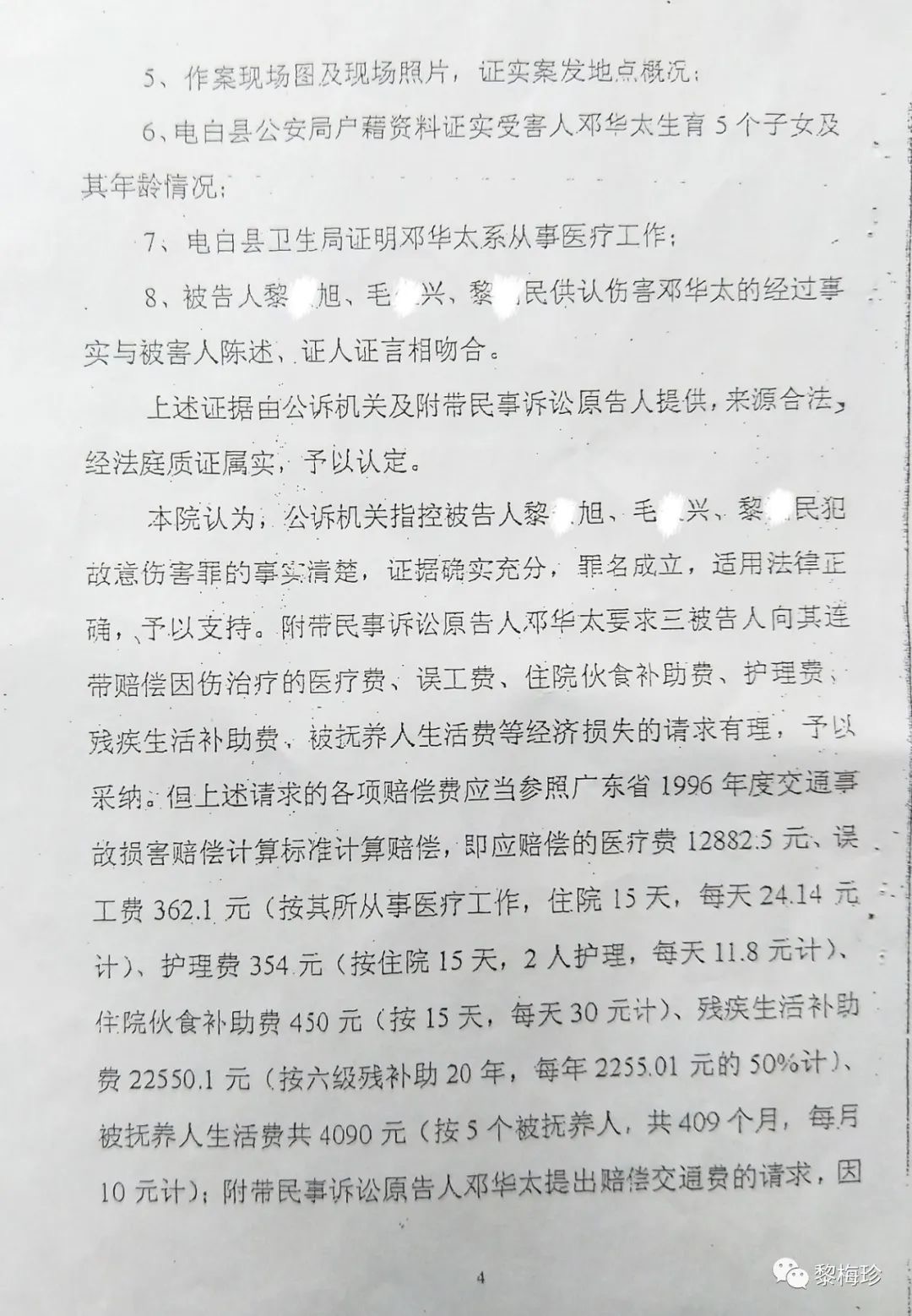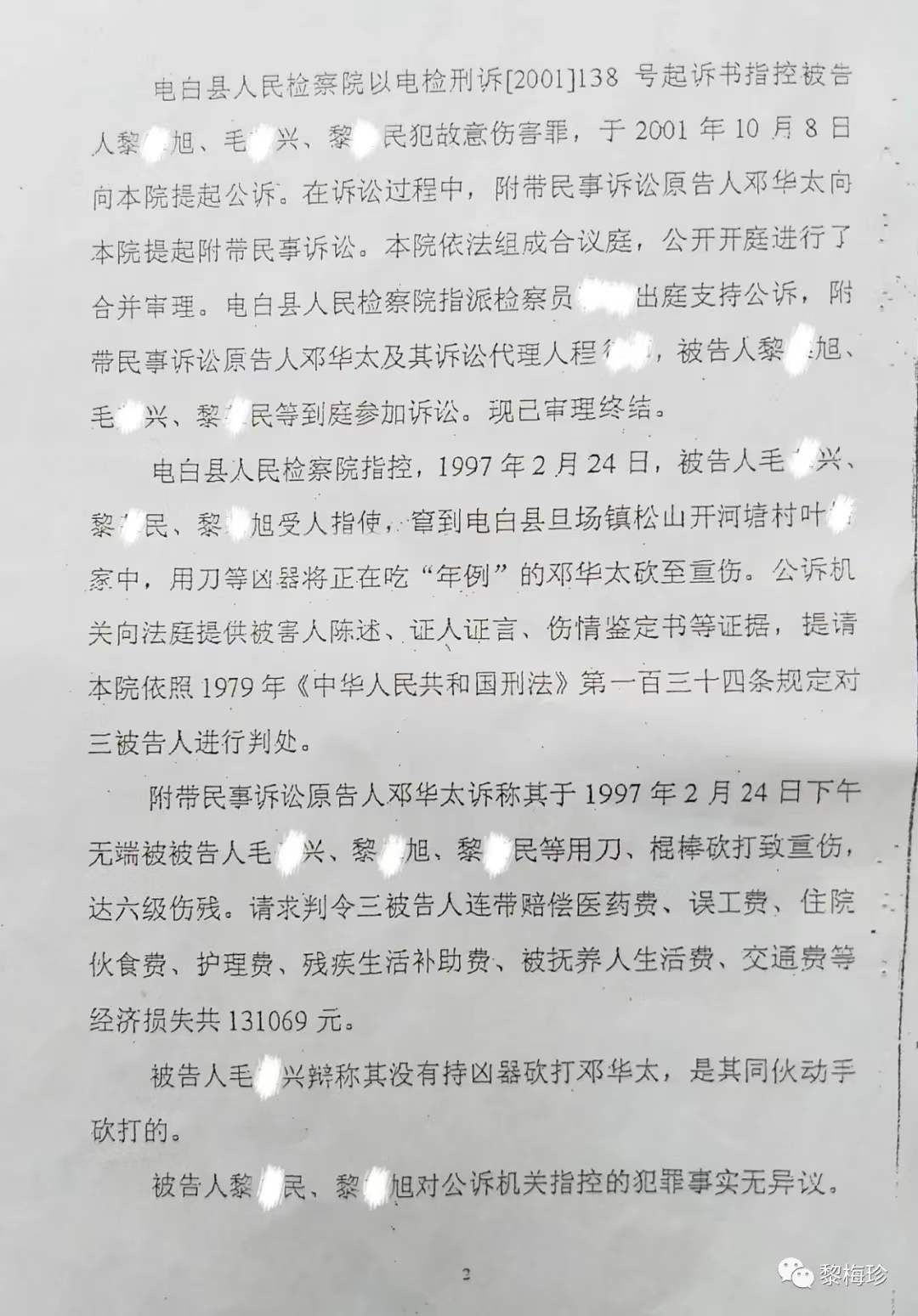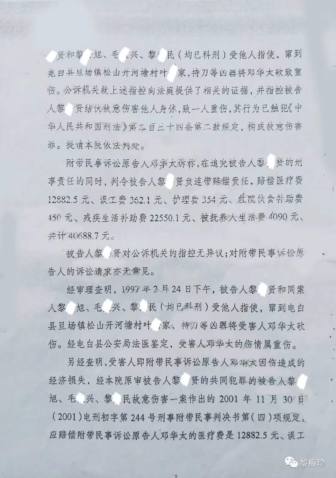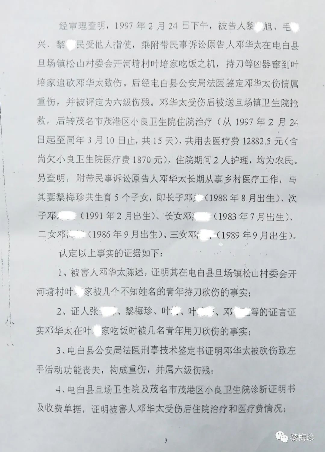 1997年2月24日,马业豪指使黎某旭、毛某兴、黎某安、黎某民(此4人已科刑),马某某、马某某、陈某某等人,用刀、枪、铁管等作案工具,凶残地把我丈夫邓华太的手砍断,重伤致残后无钱医治导致死亡,后附《电白县人民法院判决书》该案在当地曾轰动一时,搞得当地群众人心惶惶,虽然案件发生后公安机关抓获了部分涉案人员,但作为主犯的马业豪却一直没有捉拿归案,其原因主要是仗着财大气粗的姑丈谢忠文(原电白县七迳镇木等村委会书记兼主任)的保护。