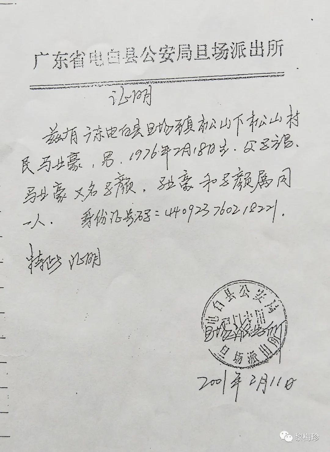 茂名市电白区旦场镇松山上松村 黎梅珍