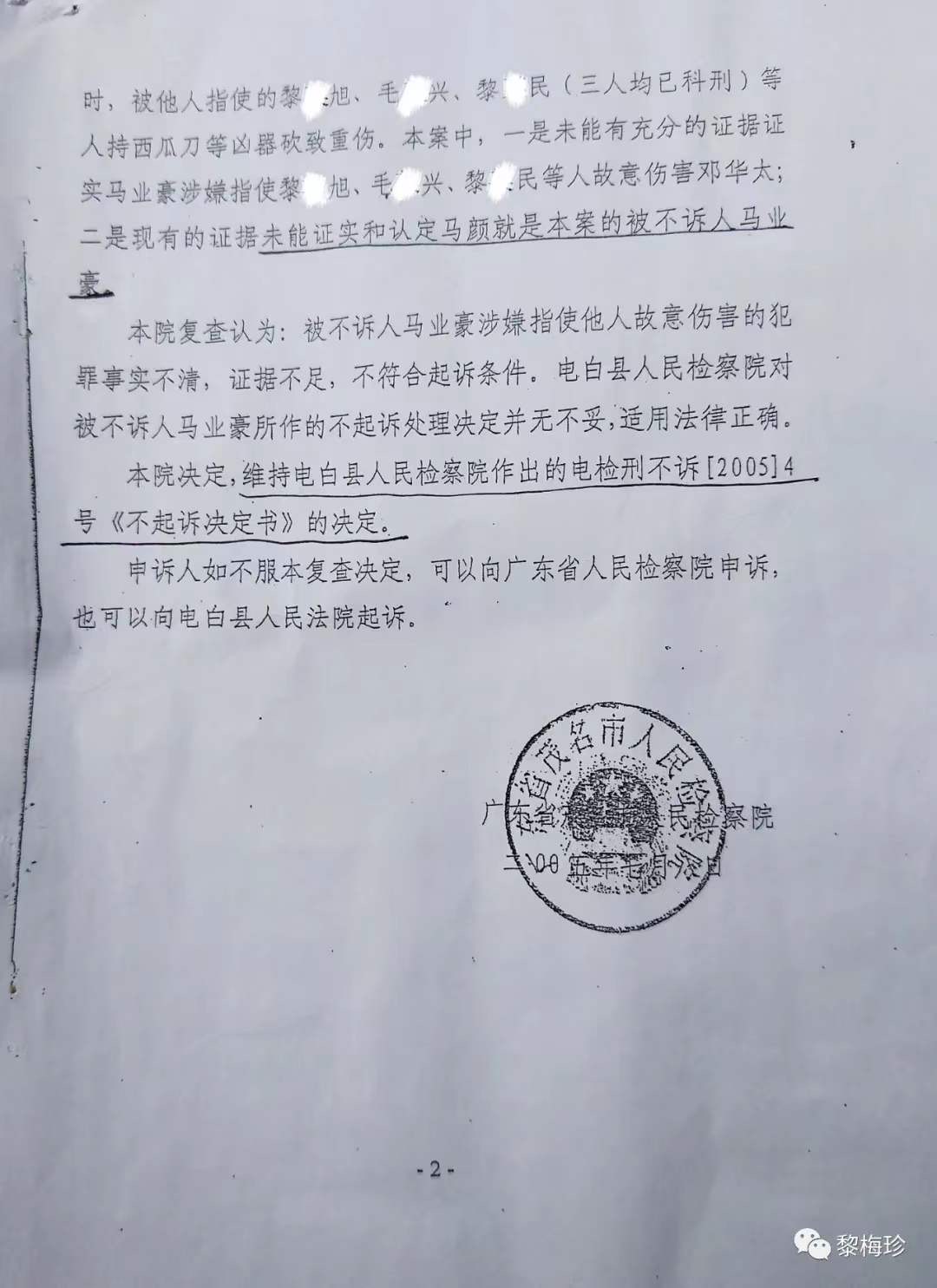 2005年,在本人不断信访、举报、投诉的多方努力下,电白县公安局终于把马业豪逮捕归案(后附:《电白公安局起诉意见书》,《提请批准逮捕书》,《重大刑事案件破案报告表》,原以为马业豪将会受到法律的制裁,但让人意想不到的是,马业豪竟然在其姑丈谢忠文的包庇保护下,利用金钱卖通关系,竟然毫发无损地走出了看所守,究其原因竟是:电白县人民检察院竟然罔顾事实,在犯罪事实清楚、证据确凿、事实上马业豪就是马颜,但电白县人民检察院却故意认定马业豪马颜不是同一个人,(电白县公安局旦场派出所证明),同案人均一致指认是受马业豪的指使作案的情况下,决定对马业豪作出不起诉决定(后附:《茂名市检察院刑事申诉复查决定书》),黑暗呀!让民妇人有冤无处可伸。