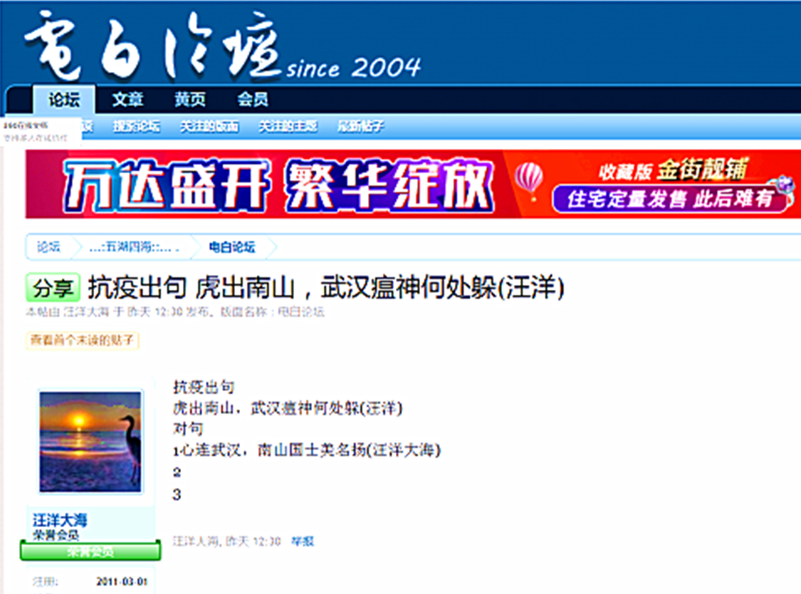 汪洋大海出句 ," 虎出南山,武汉瘟神 何处躲 ",咒骂武汉是瘟神,和美国《华尔街日报》骂中国东亚病夫更有过之而无不及。武汉瘟神是一个侮辱中国人的词组,在公众论坛上,公开骂武汉瘟神何处躲 ,汪洋大海以为论坛上无人会识破这种汉奸的手法,以为论坛上无人识字,汪洋大海以前也曾用这种手法咒骂救火英雄烈士。汪洋大海这个垃圾,汉奸。