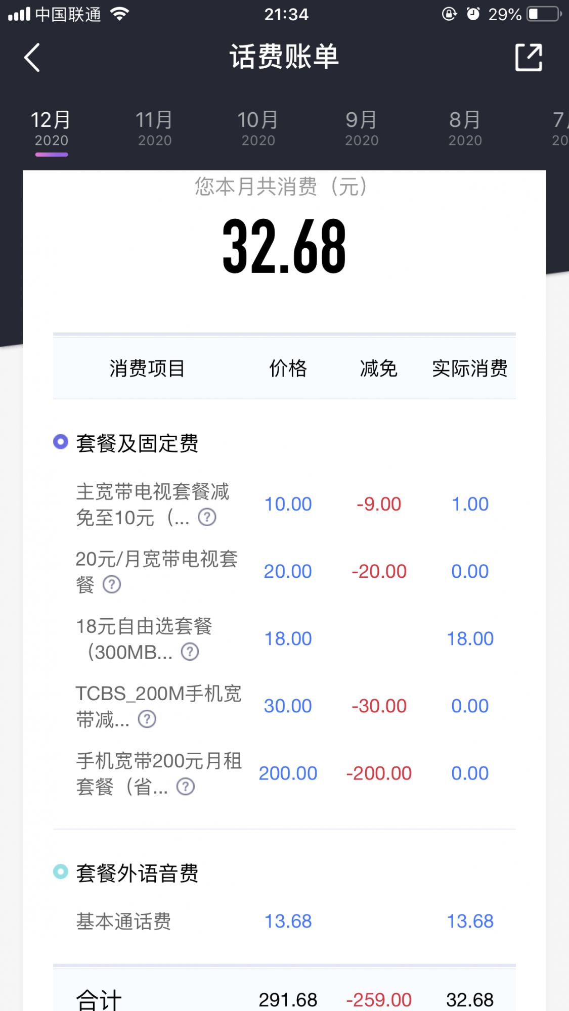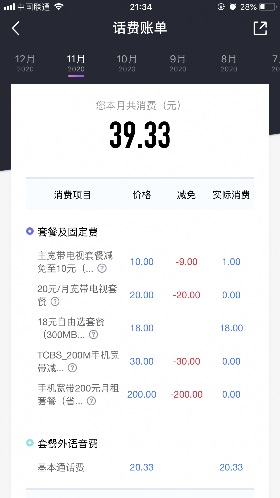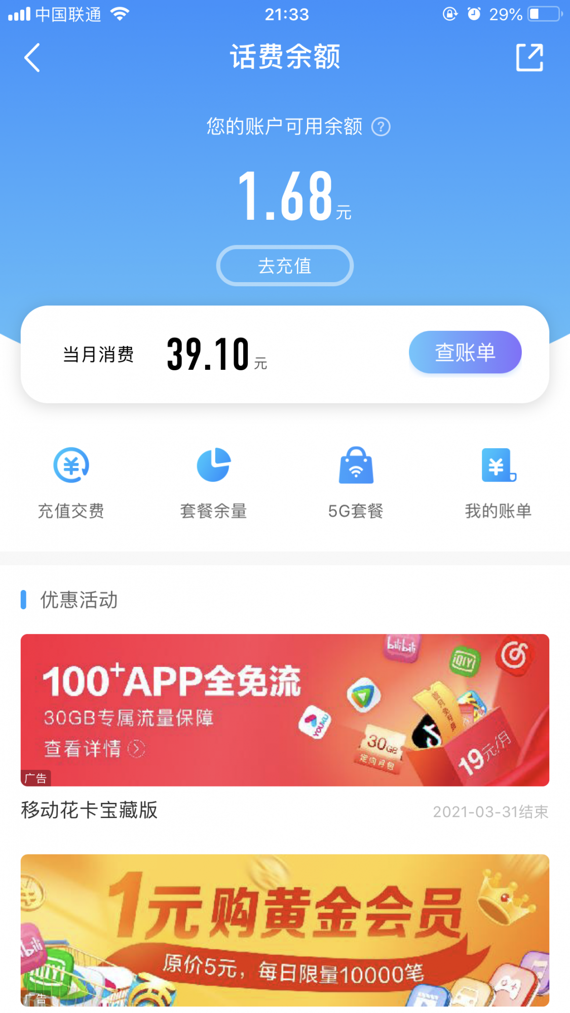 后来才知道这是预付费的,当初办卡没有告知我这个情况。每次充值也不是几百几百的冲,只是每次提示欠费了就冲几十,想着能够抵扣月租能够正常接听电话就行。之前58套餐捆绑用了一年莫名其妙,之后换了18月套餐话费每月要二十三十,于是又打客服咨询,12月更改了38元套餐,送240分钟以为会比较贴心,今天又是提示欠费然后充值了50元,我特地上app看了账单什么也没看懂,预扣费39月租怎么剩下1块多钱,还有十来块哪去了?特地打了人工客服也没说清楚就叫我查账单,总而言之这个卡用得一头雾水,清单根本看不懂,感觉总是在缴费。我不知道其他人懂不懂,这种预付费我是用怕了,还是找个冲多少用多少,没钱停机的那种好点。