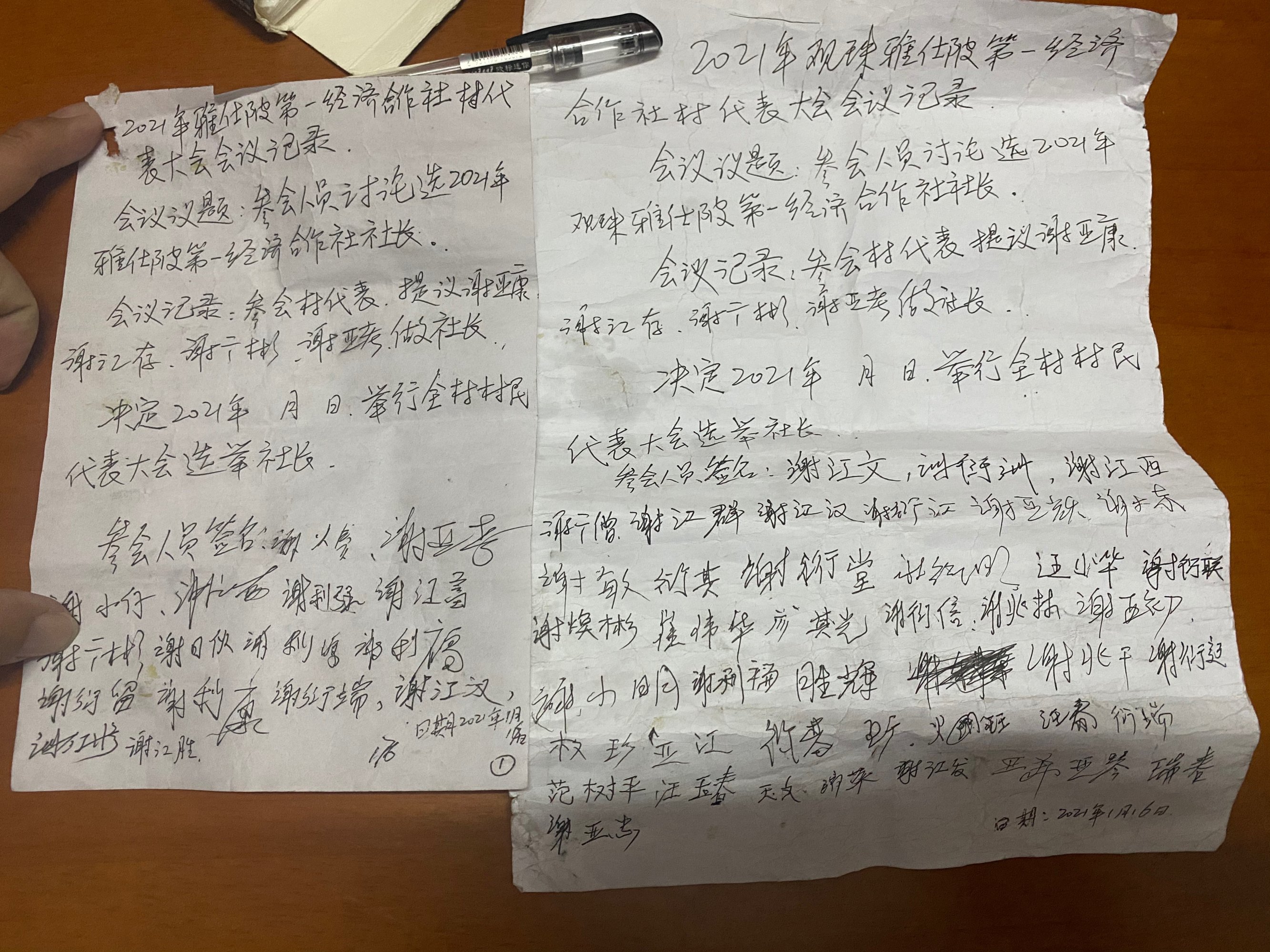 我们已于2019年10月,召开多次队员大会表决,要求罢免他社长一职。也将罢免他的申请书交过给村委、和镇组织部,但一直无下文。现在在队员毫不知情的情况下选举,又是他用假选票选上了自己,我们队多人多次打电话,和到村委会反映不能让不称职的谢亚科再做组长,谢勇主任回复我们是现在我们已合法合规地选出他做小组组长了,你们迟点再开会选社长。我们问主任到底什么时候选社长.他说未定.最迟会在2021年4月完成。现在我们全体队员,都不想让个不是我们自己一户一票选出来的偷选票人,做我们的组长。今天中午11点半,我们队两个代表出到镇组织部反映问题,结果没有找到相关人员。而是遇到了观珠村马路头队,五个队员代表出来镇政府,反映和我们队同样的问题,他们队决定明天中午10点半再次出镇政府反映问题。我们队员晚上应谢勇主任约.19:30分到村委会协商问题,结果谢勇主任说我们来的人员太多要报警处理,那就没有谈成。雅一队代表以全体队员开会,发现谢亚科选举作弊为由,报警处理。观珠派出所人到场了解后,说你们双方在村委这无法解决这个问题,明天出镇政府处理。我们只好回去明天上午10点半钟,再去镇政府处理我们村雅一队的这次乌龙选举。