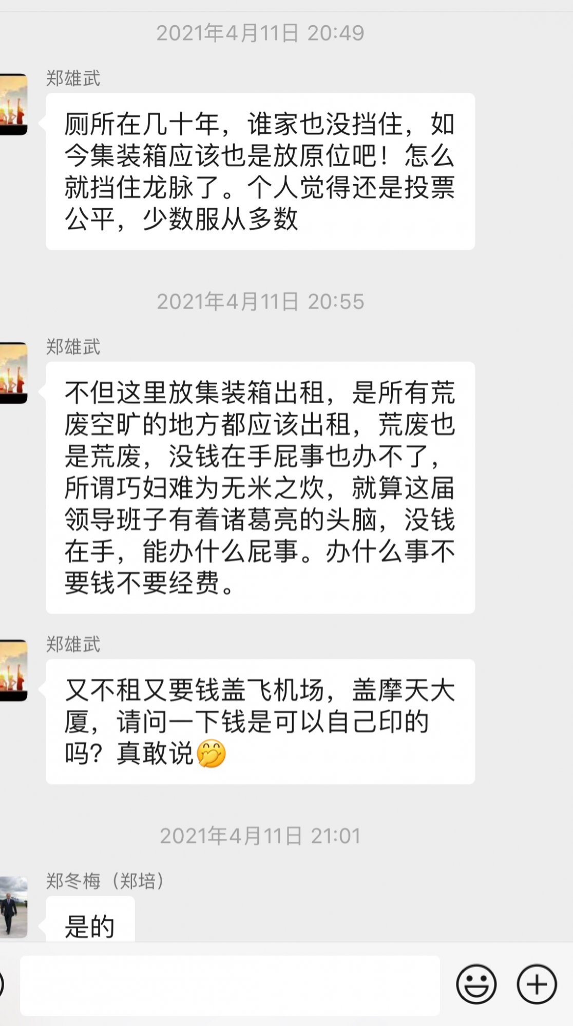 民主自决,少数服从多数。这段时间收到多名村民的私信,多数是反映村口空地处置问题。主要有不满村口停车乱象影响村民出行问题,也有不乐意见空地被边上几户人占为己用,建议要么好好利用起来做公益,要么盖回村厕所。也有人多次说到郑庆友私心重。