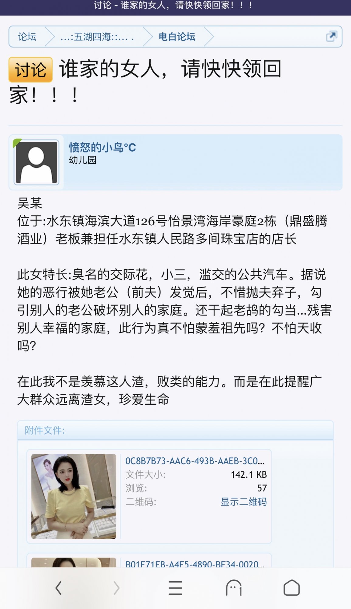 此女特长:臭名的交际花,小三,滥交的公共汽车。据说她的恶行被她老公(前夫)发觉后,不惜抛夫弃子,勾引别人的老公破坏别人的家庭。还干起老鸪的勾当...残害别人幸福的家庭,此行为真不怕蒙羞祖先吗?不怕天收吗?
